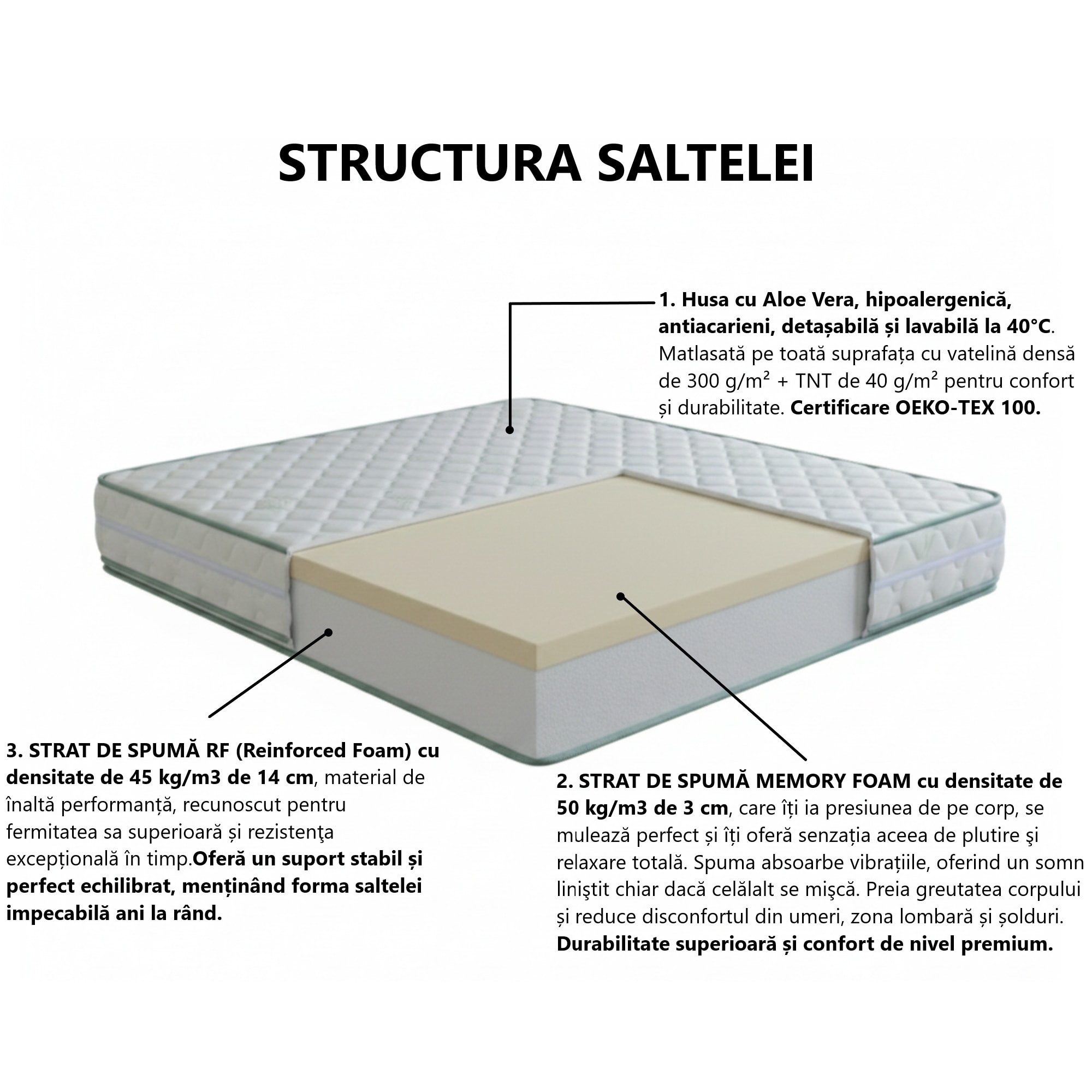 | Caracteristici cheie | Hipoalergenic Reversibila Ortopedica Strat din spuma poliuretanica Antiacarieni Tratat cu Aloe Vera Strat spuma memorie |