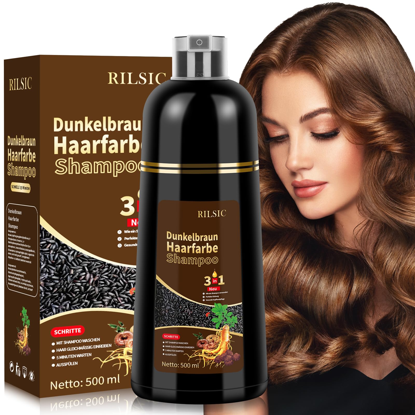 Sampon natural RILSIC 500ml, 3 în 1, saten închis, pentru femei