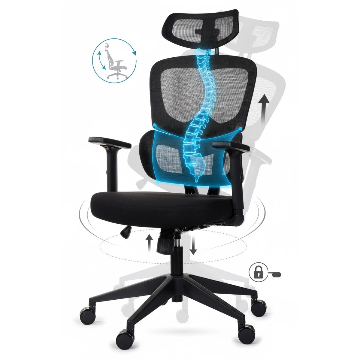 Scaunul asigura ergonomie deosebita datorita cotierelor reglabile (7 cm vertical), care iti permit sa mentii o postura corecta la birou — esentiala pentru sanatatea coloanei si confortul general in timpul lucrului.