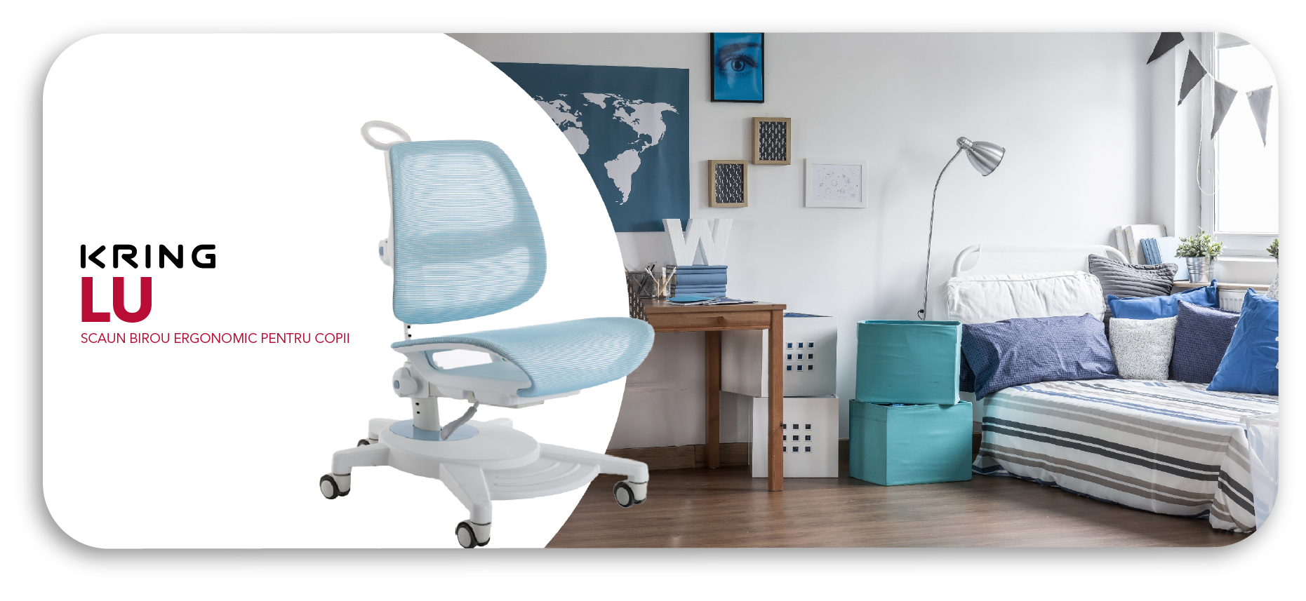 Scaun birou ergonomic pentru copii, Kring Lu, roti autoblocante, material impermeabil, sezut si spatar reglabile, Albastru deschis