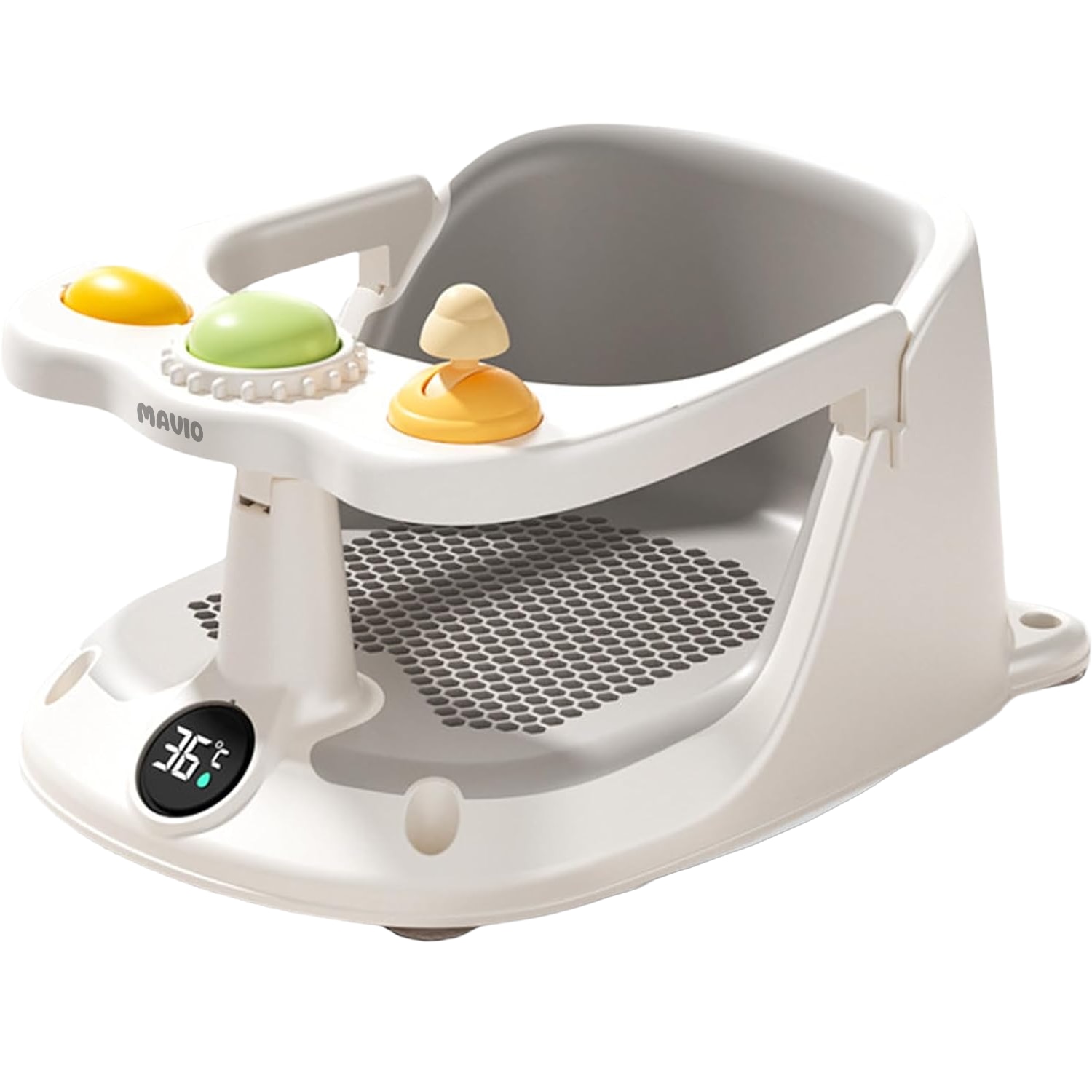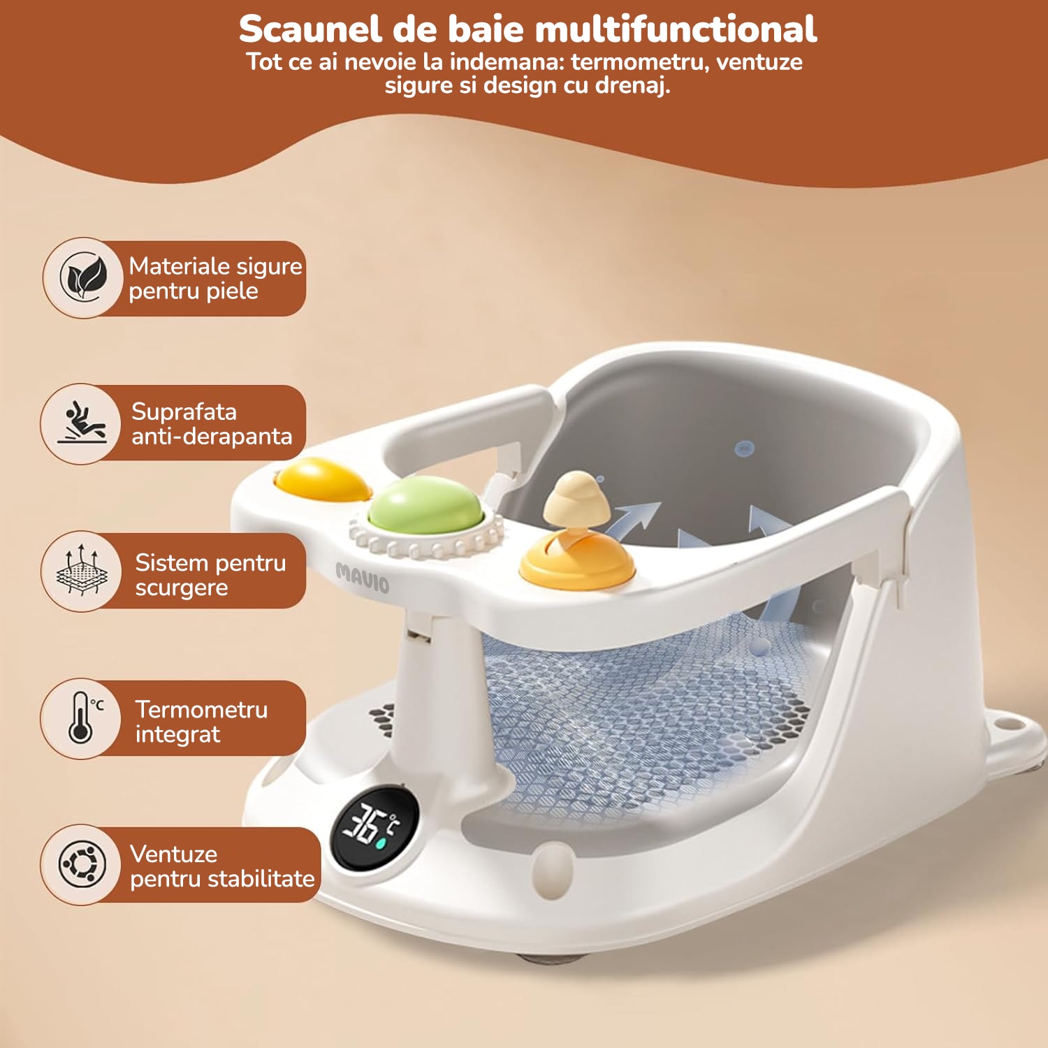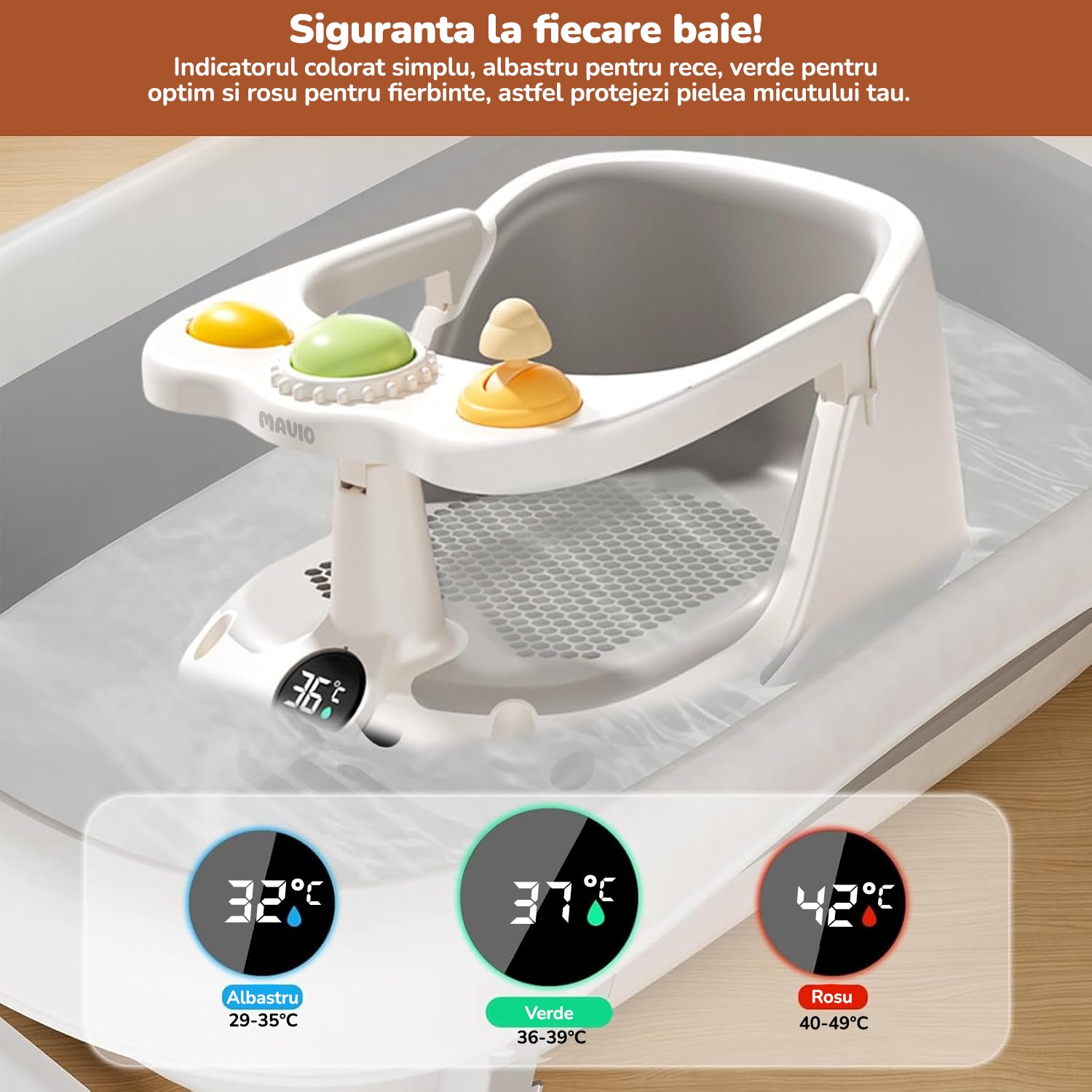 Scaun de Baie pentru Bebelusi Mavio®, Termometru Digital Integrat, Sistem Blocare, Varsta 6 luni+, Practic, Usor de Folosit, 4 Ventuze Fixare, Gauri Scurgere, Sezut si Spatar Confortabile, Materiale Sigure
