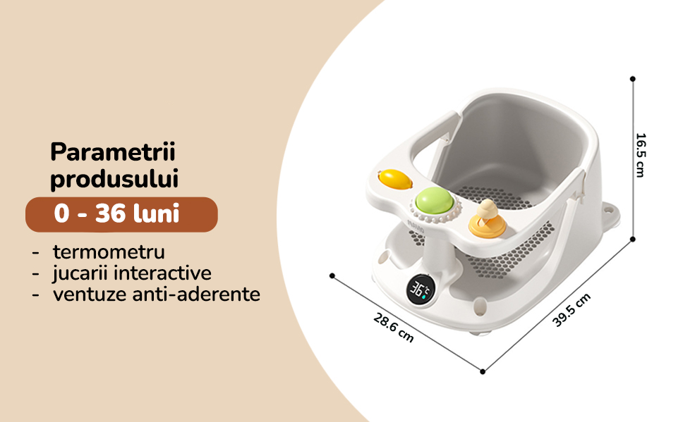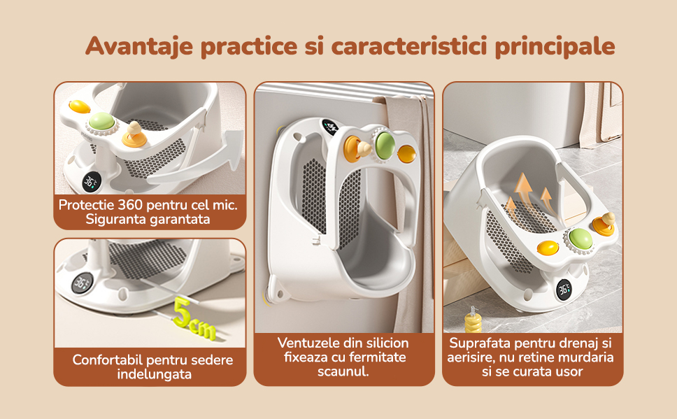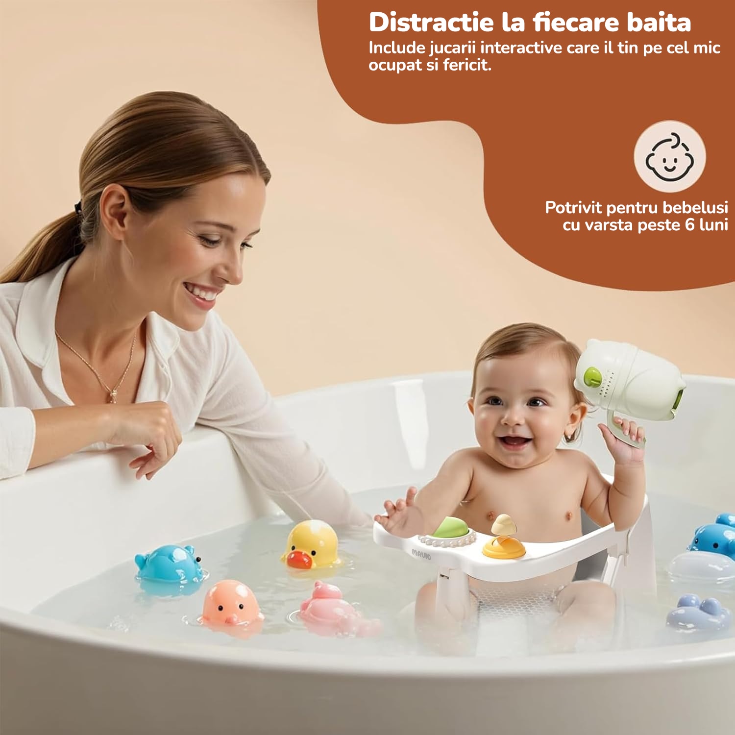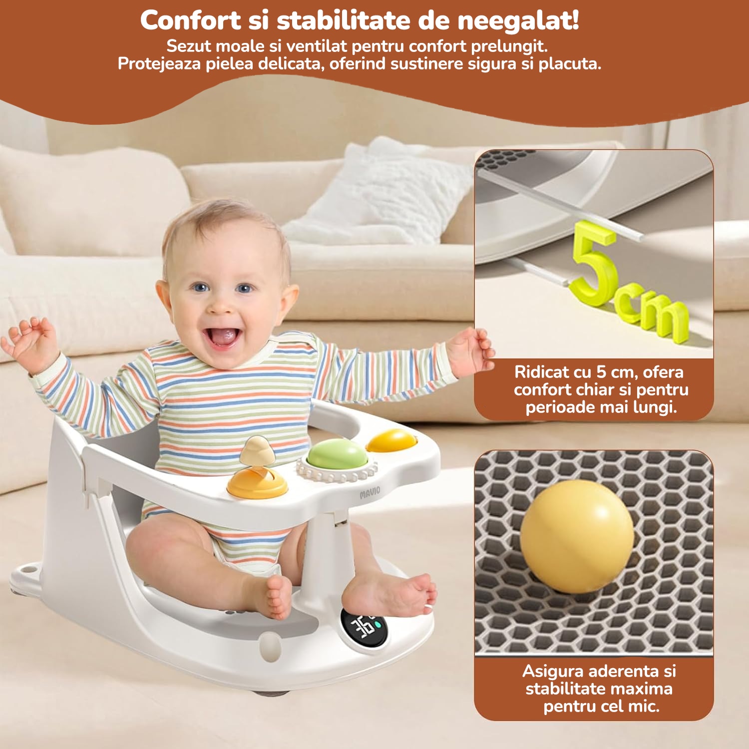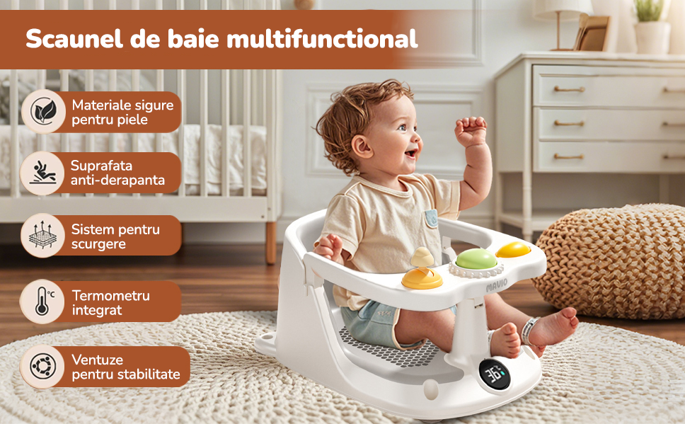 Scaun de Baie pentru Bebelusi Mavio®, Termometru Digital Integrat, Sistem Blocare, Varsta 6 luni+, Practic, Usor de Folosit, 4 Ventuze Fixare, Gauri Scurgere, Sezut si Spatar Confortabile, Materiale Sigure