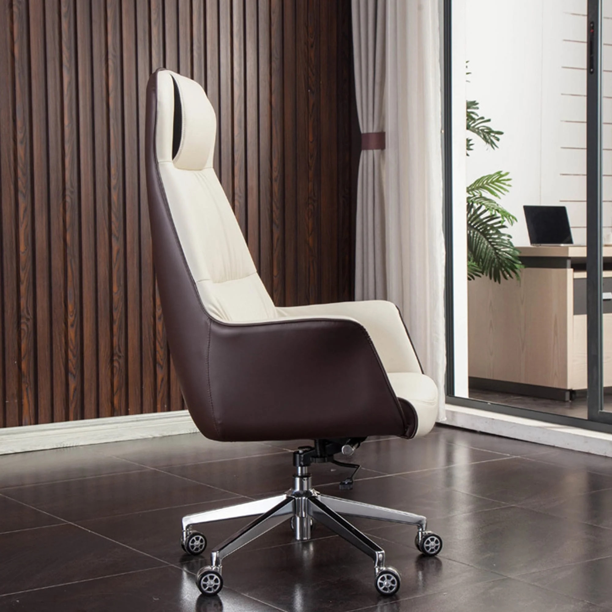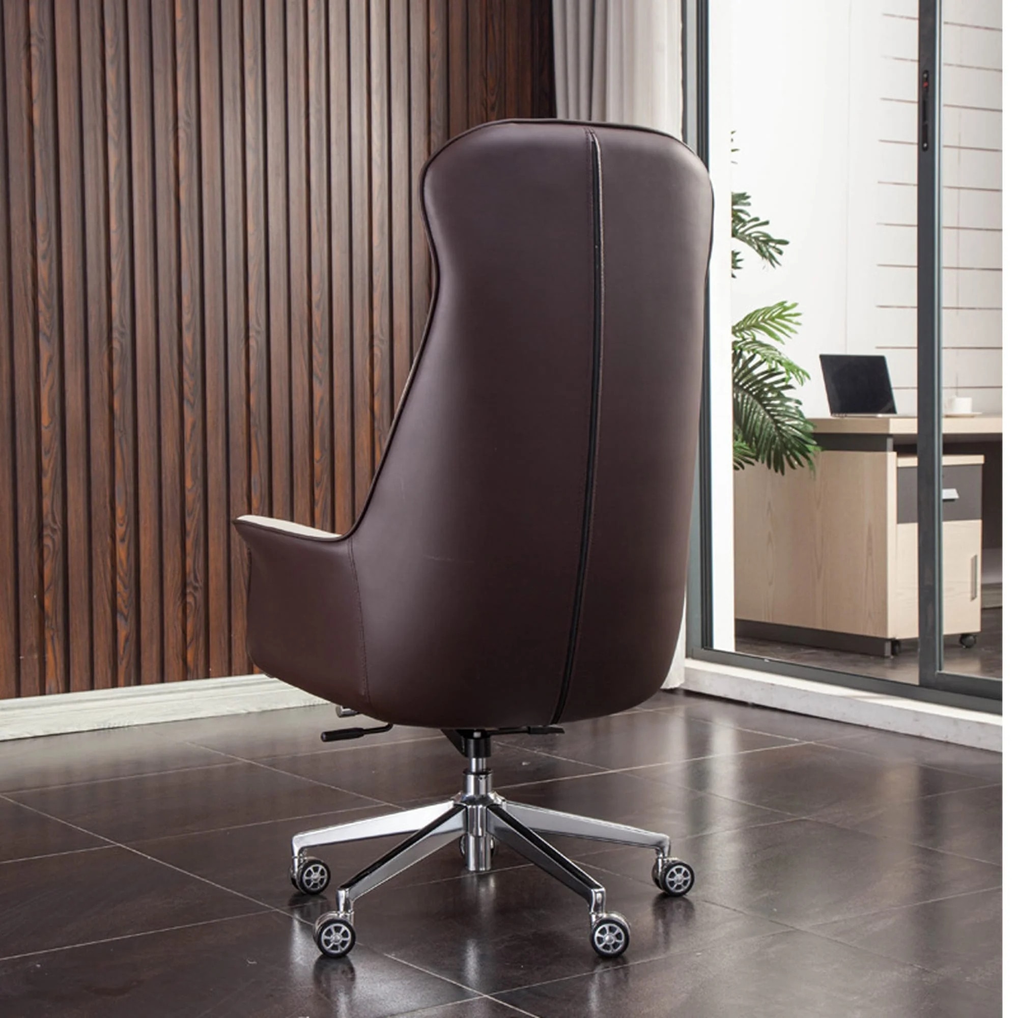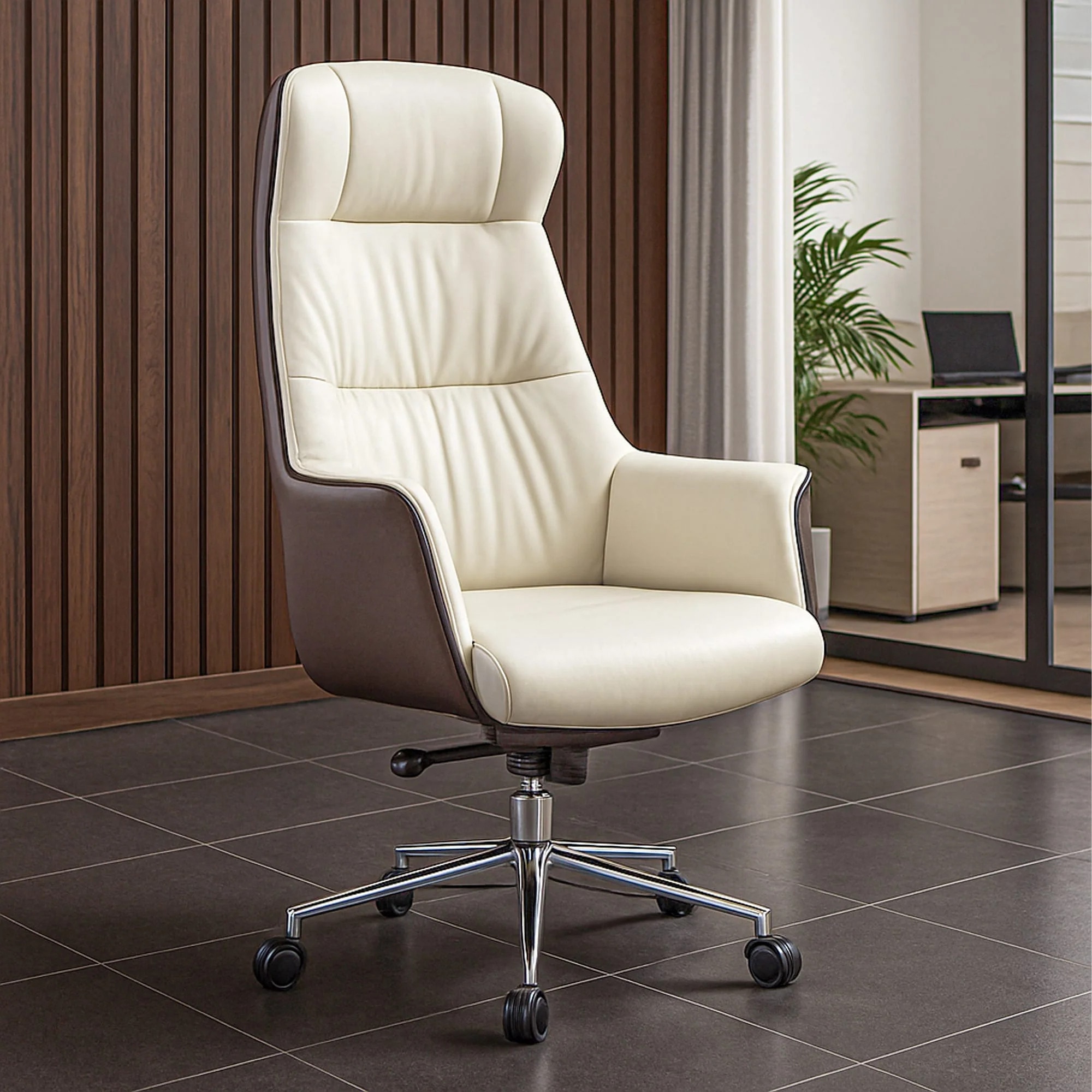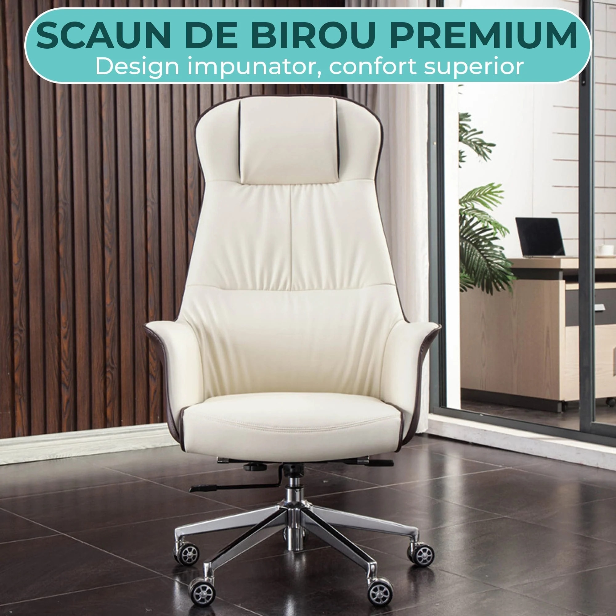 Acest scaun directorial combina piele naturala, spuma cu densitate mare si cadru din lemn pentru sustinere si rafinament, iar reglarea pe inaltime si baza rotativa te ajuta sa mentii postura corecta si confortul pe termen lung.