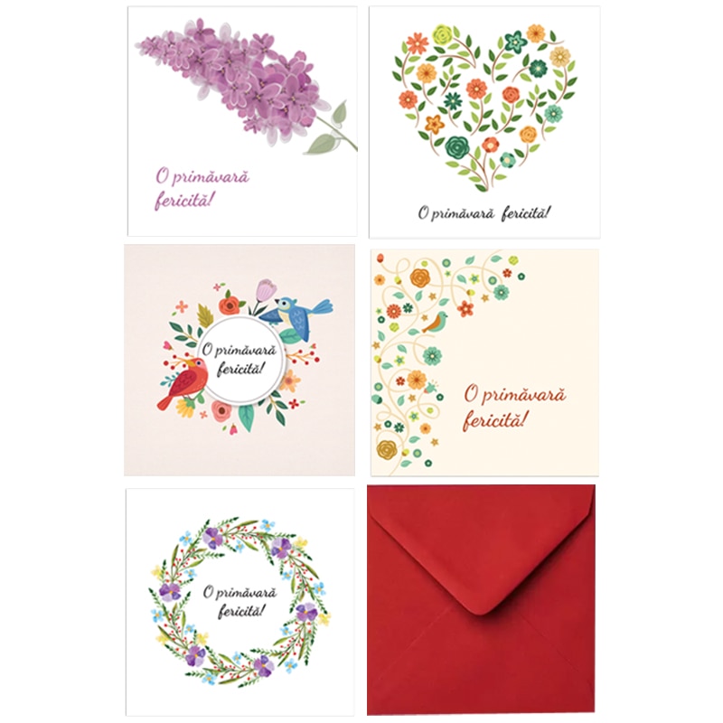 Set 10 felicitari martie mix grafic, 130x130 mm, cu plicuri rosii