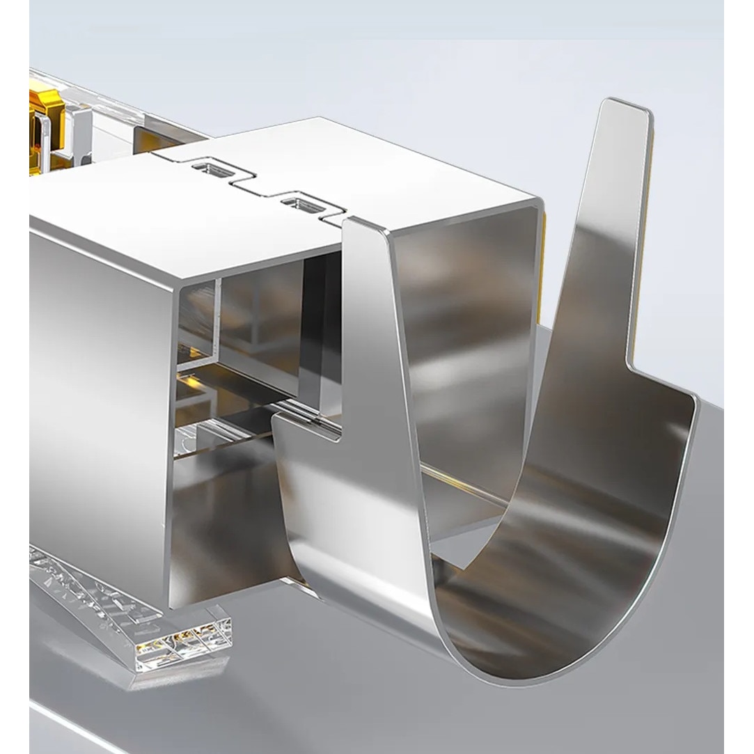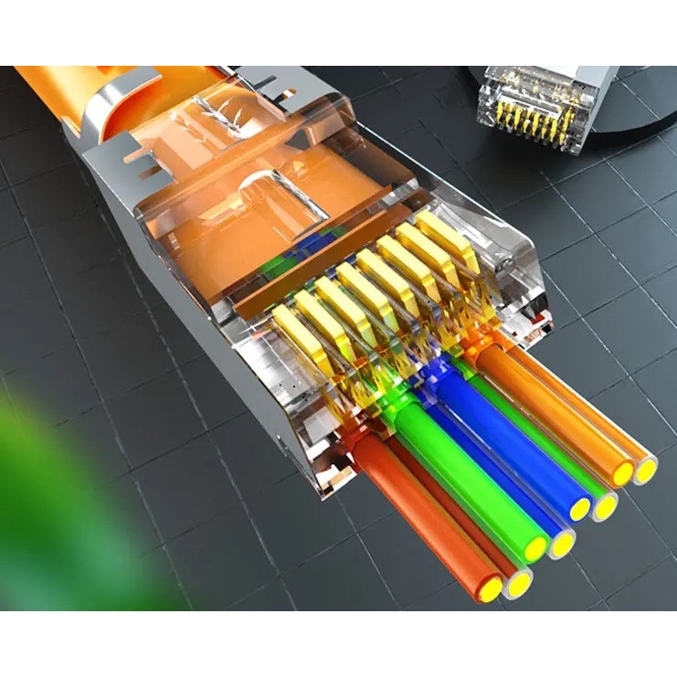 Set 100buc - Mufa RJ45 PASS-THROUGH ecranata/cu manson transparent, pentru cabluri CAT6 CAT6A CAT7 cu fire groase 23AWG, pini suflati cu Aur 50microni