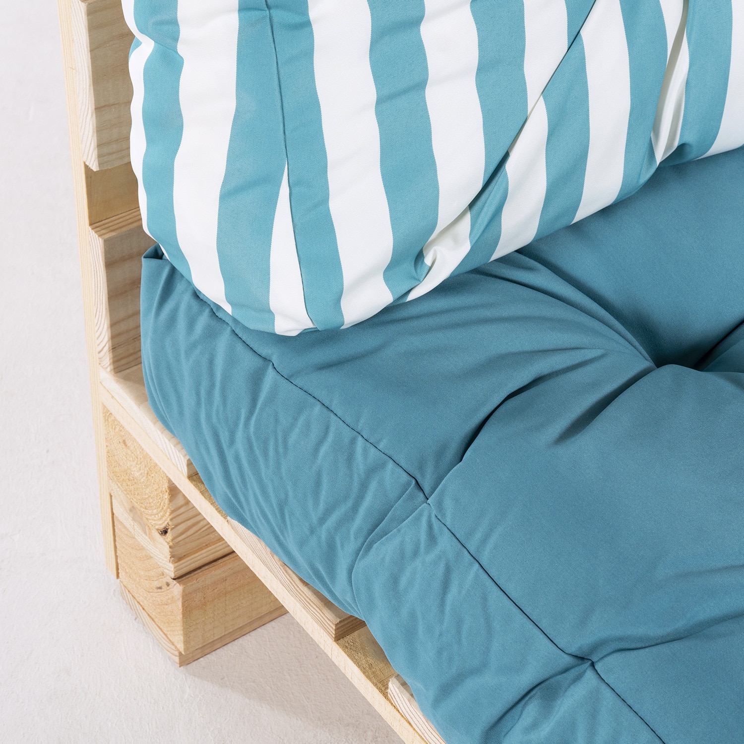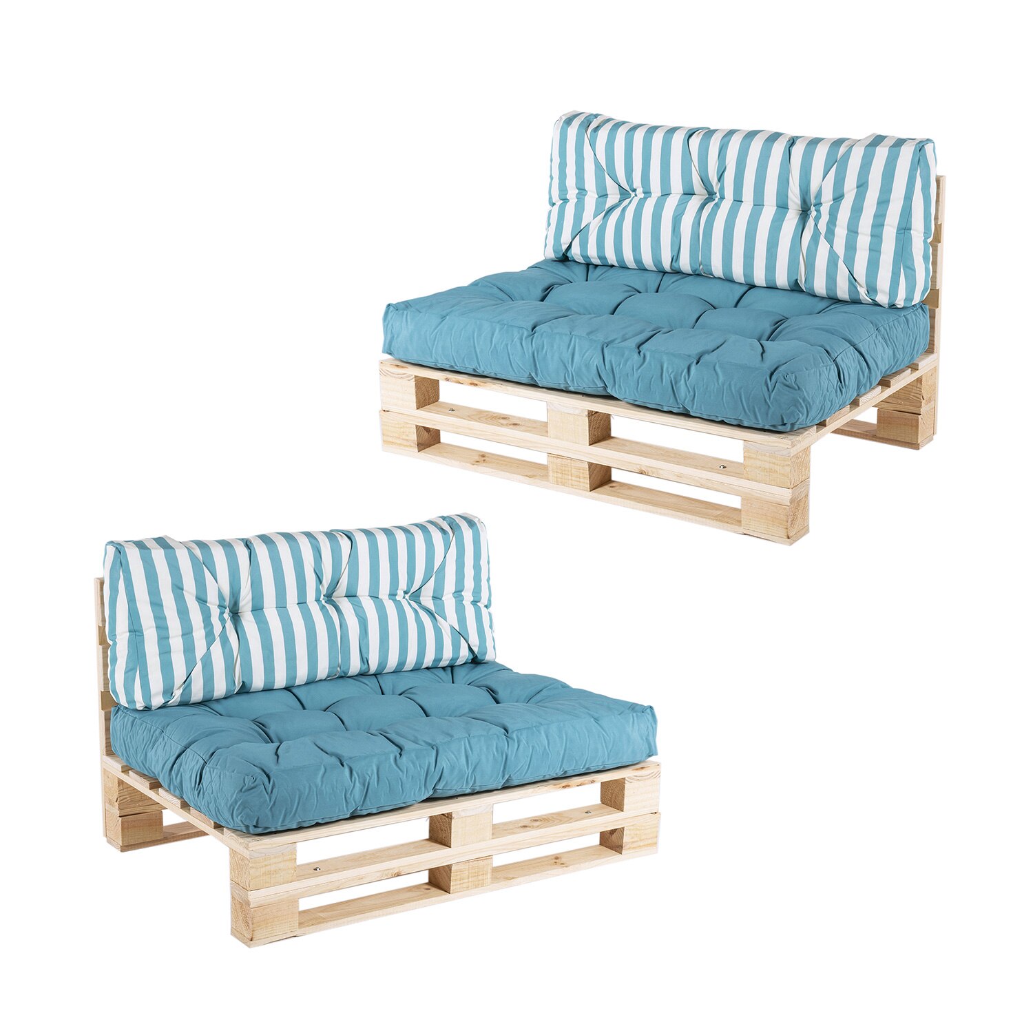 Set 2 canapele paleti pentru gradina, Lemn/Poliester, Perne incluse, 80/42x120x16 cm, Turcoaz/Alb