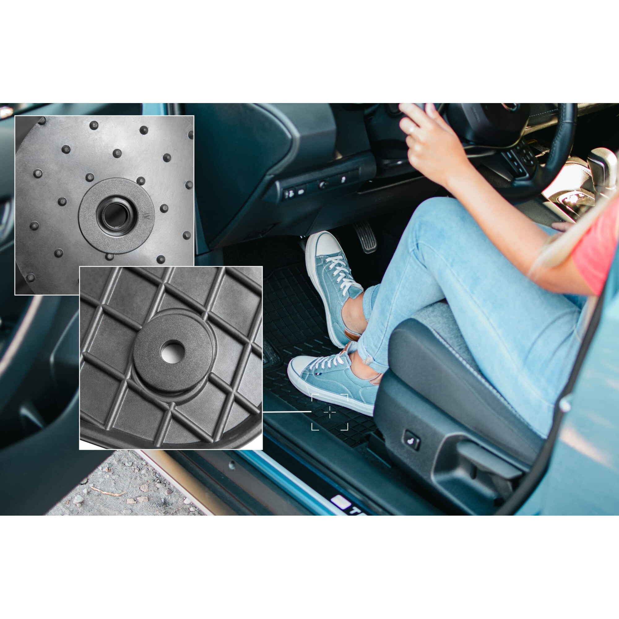 Pe partea inferioara a covoraselor se afla niste picioruse care impiedica deplasarea covoraselor in timpul condusului.