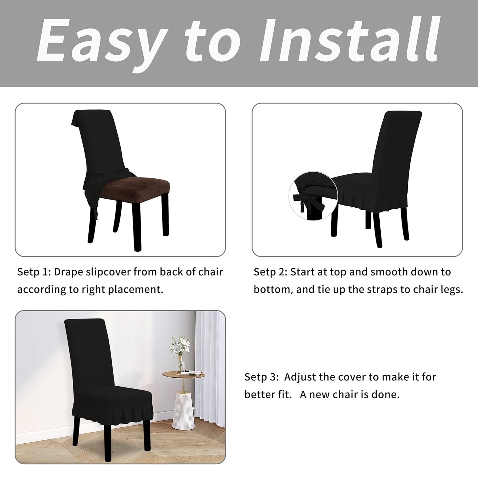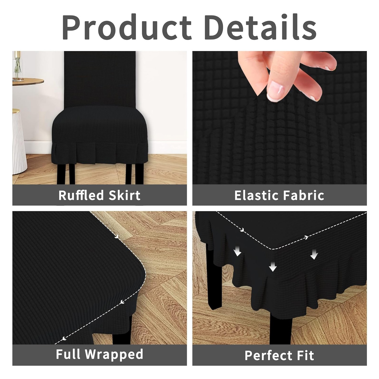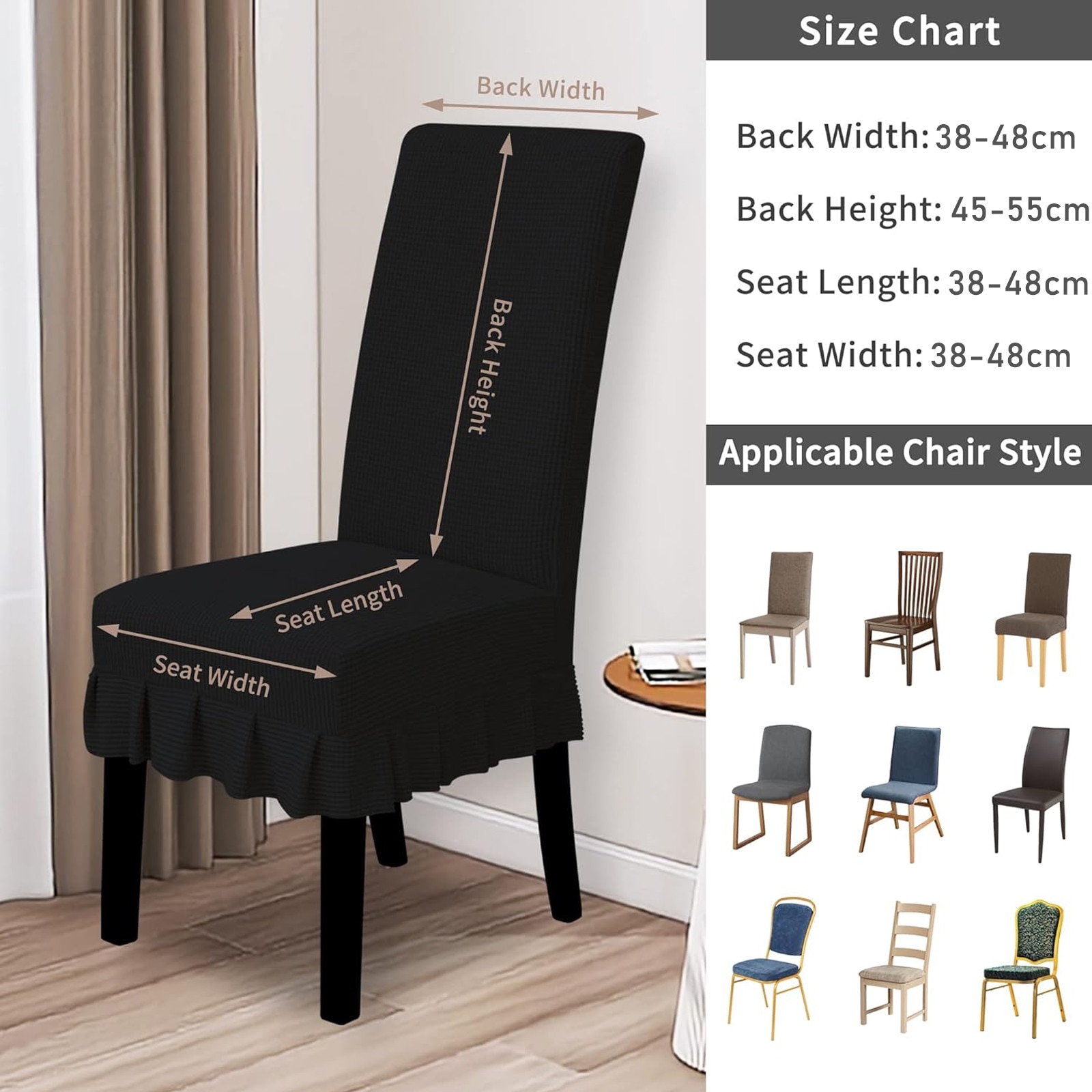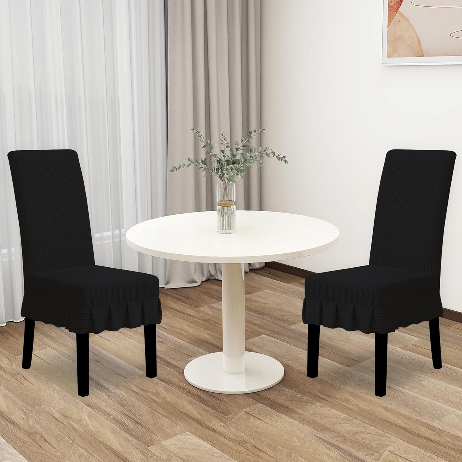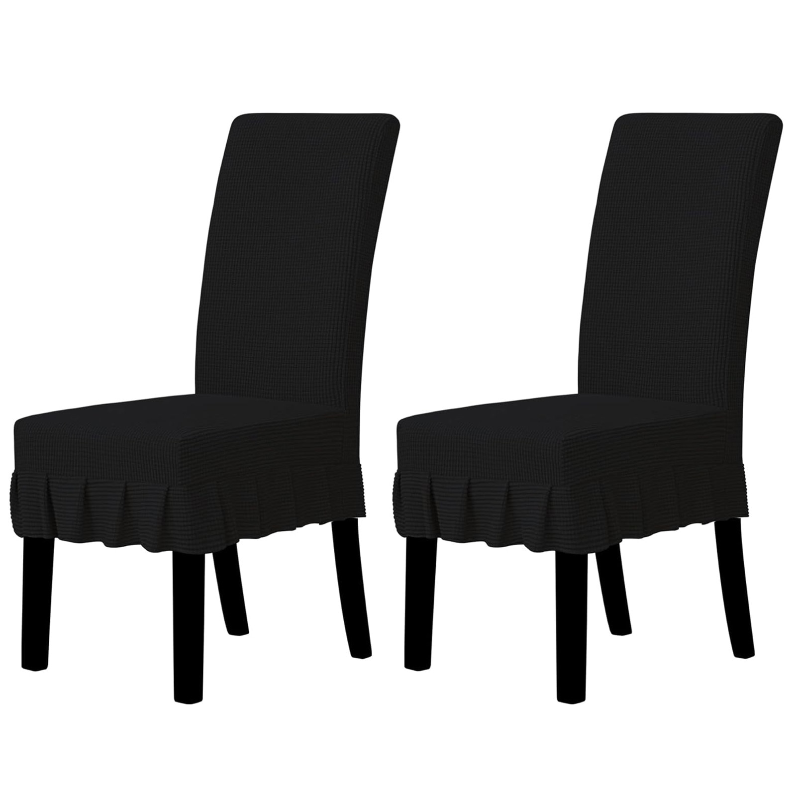 Set 2 Huse Scaun, Zggzerg, Husa pentru scaun jacquard, Huse pentru scaune elastice, Rezistent la ulei, Centura elastica, Cu volanase, Moale si usor de curatat, Pentru decorarea bucatariei, sufragerie, hoteluri, Poliester, Negru