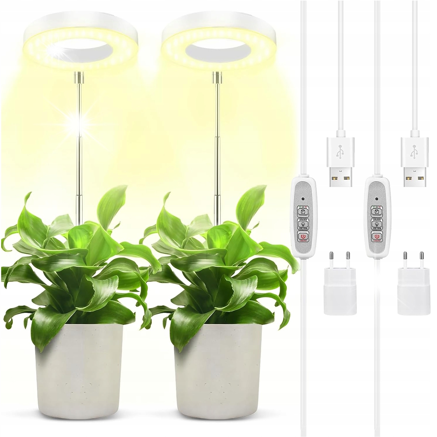 ?Set de 2 lămpi LED Full Spectrum pentru creșterea plantelor, lămpi pentru creșterea plantelor de interior, cu temporizator automat și adaptor USB, 4 niveluri de luminozitate, înălțime reglabilă 20-64 cm (alb)?