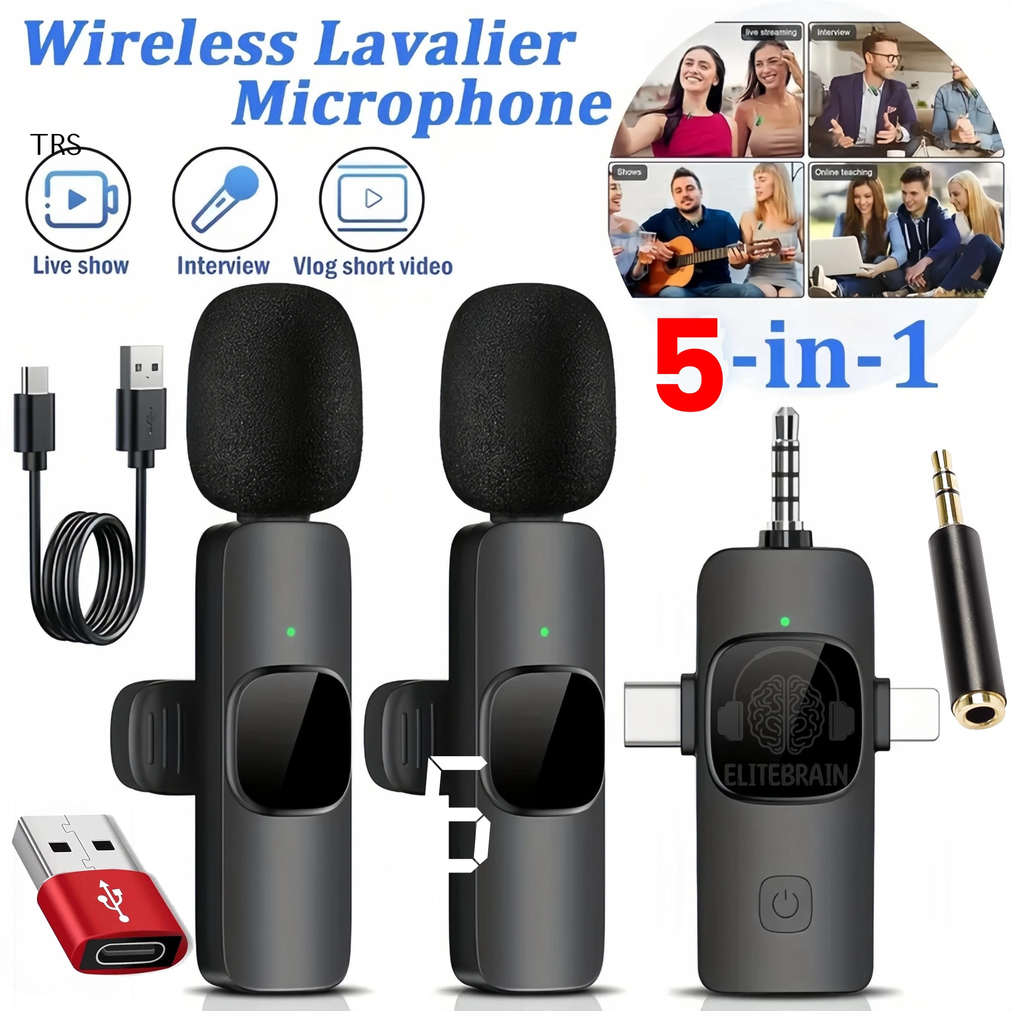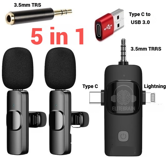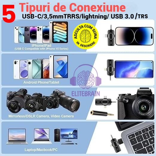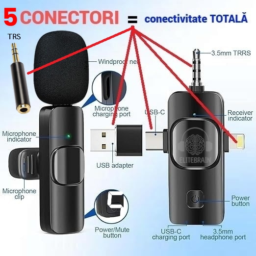 Set 2 microfoane profesionale lavaliera 5 in 1, Elite Brain®, Compatibilitate Totala, USB C, USB 3.0, Lightning, 3.5mmTRRS, 3.5mmTRS reducere zgomot ambiental, Android, iPad, Laptop, DSLR camera