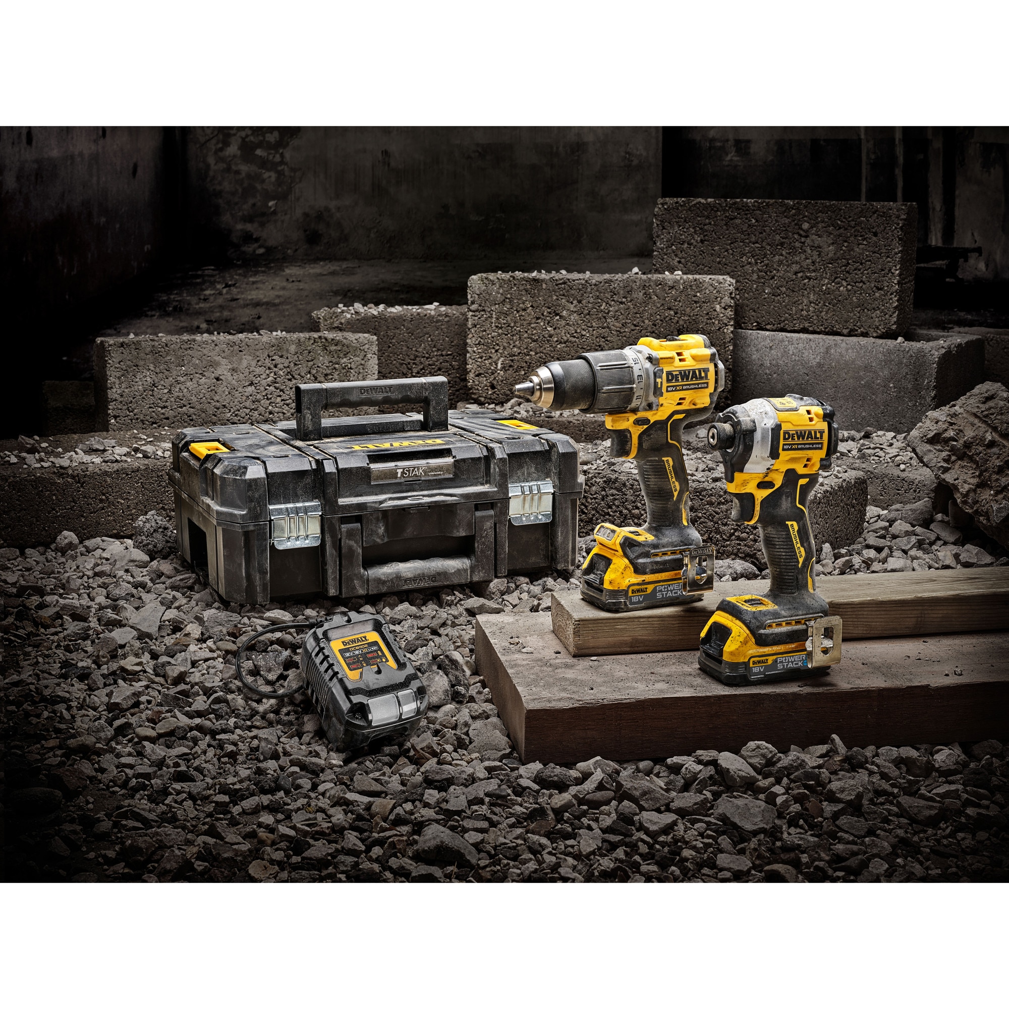 Set 2 scule profesionale pe acumulator DeWALT DCK2050E2T, 18V XR, motor fara perii, masina de gaurit cu percutie DCD805, masina de insurubat cu impact DCF850, 2x acumulator Li-Ion 1.7 Ah POWERSTACK, incarcator rapid, cutie transport TSTAK