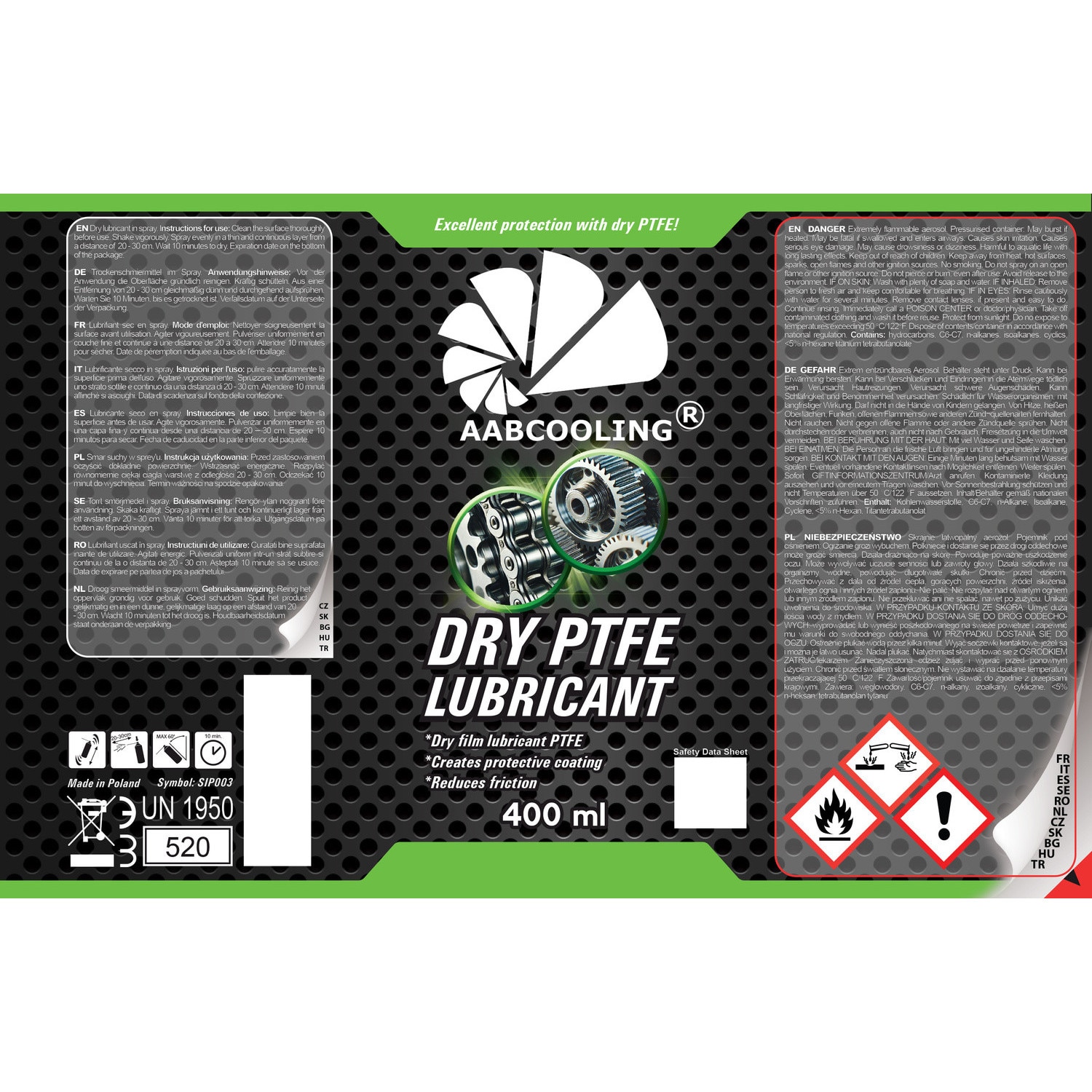 Produsul se caracterizează printr-un film lubrifiant uscat, care nu atrage praful, murdăria sau pulberea, fiind ideal pentru locurile unde nu pot fi utilizați lubrifianți grași sau uleioși. AABCOOLING Dry PTFE Lubricant oferă o protecție de lungă durată. Poate fi utilizat atât în industrie, în atelier, cât și acasă.