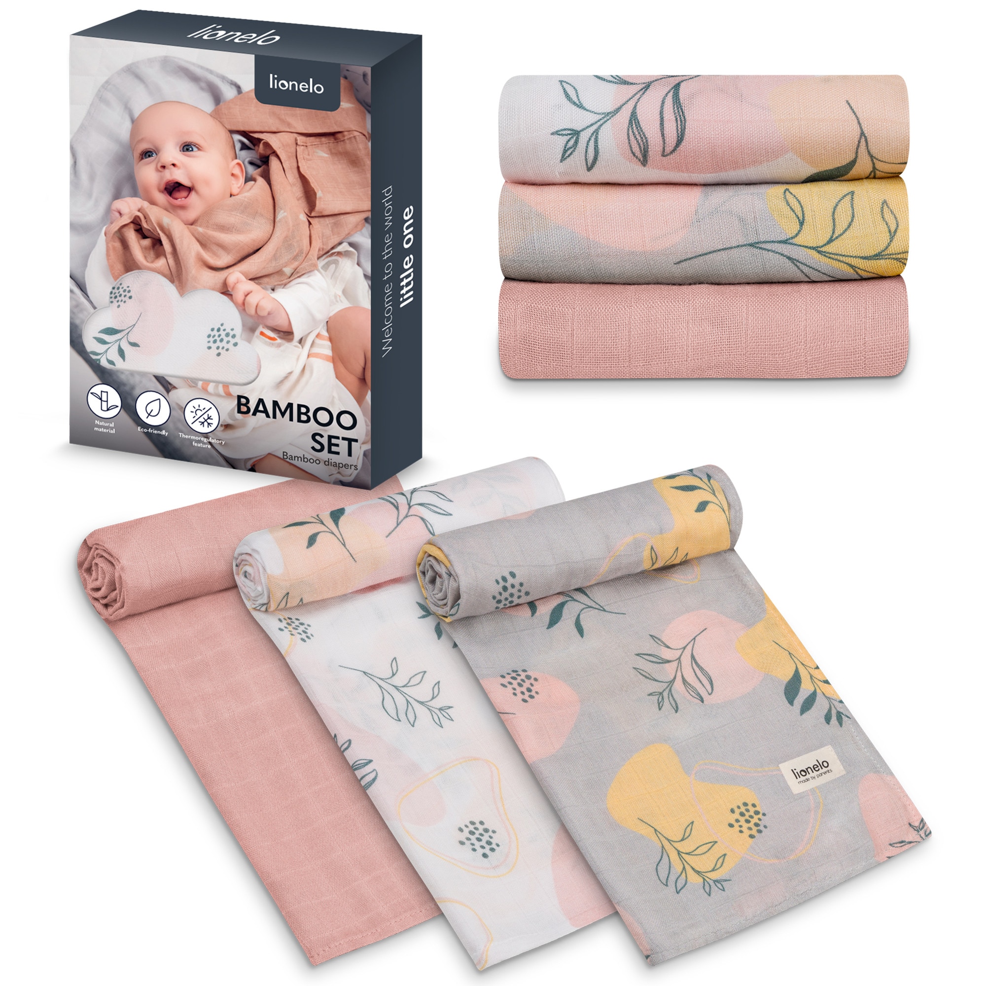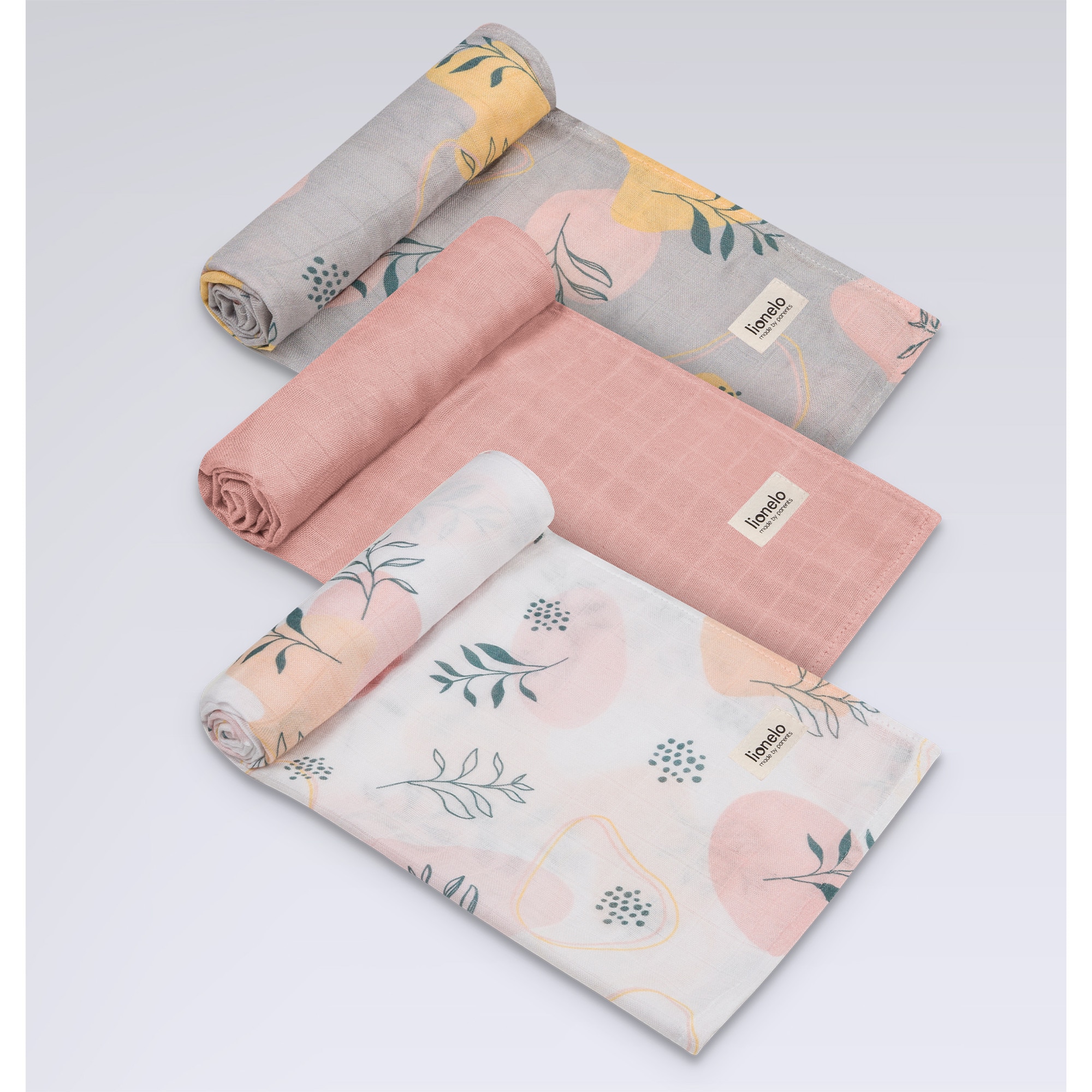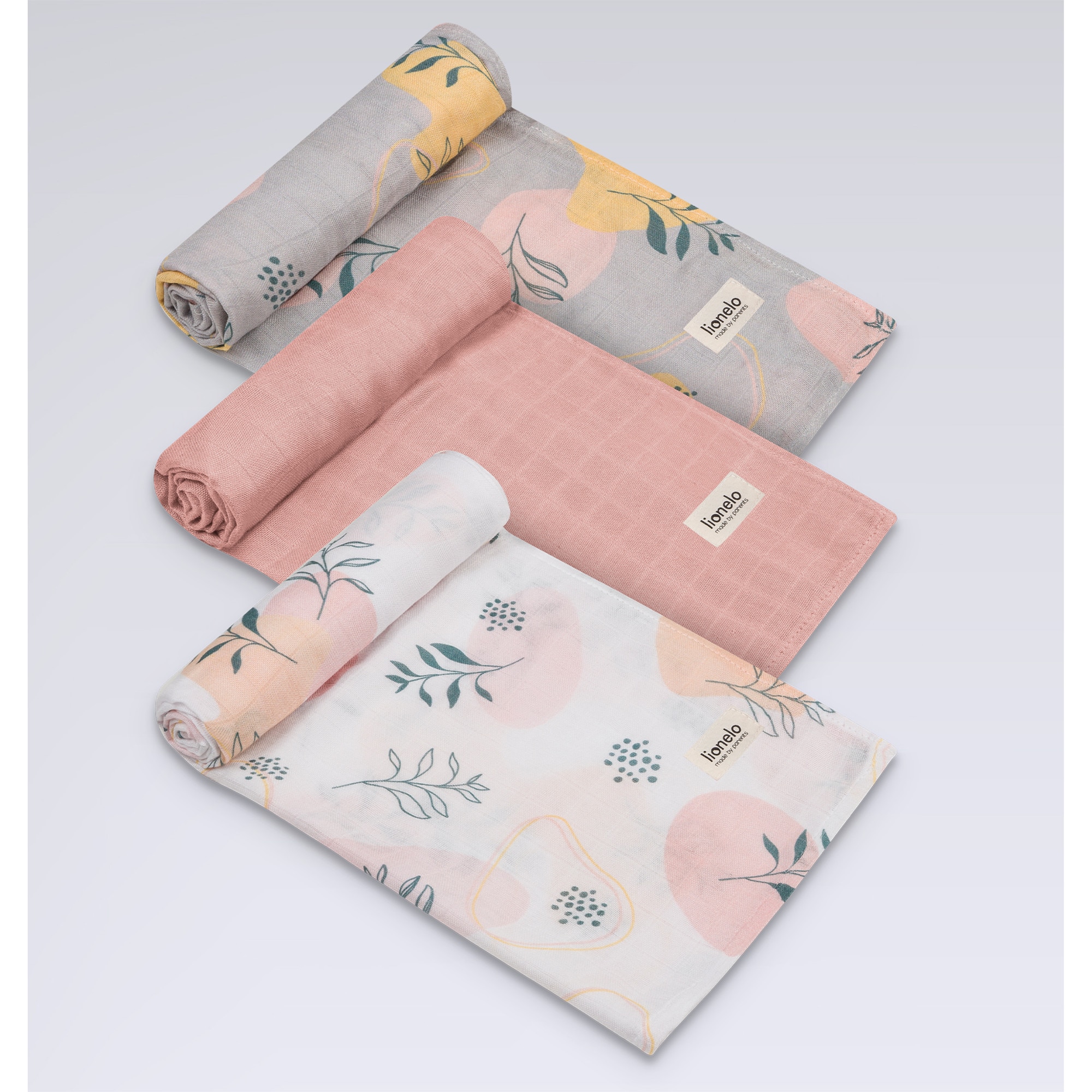 Set 3 museline, Lionelo, Leaf, Multifunctionale, Din bambus, Ideale pentru infasat, Cu proprietati antialergice, Lavabile la masina de spalat, 70x70 cm, Multicolor