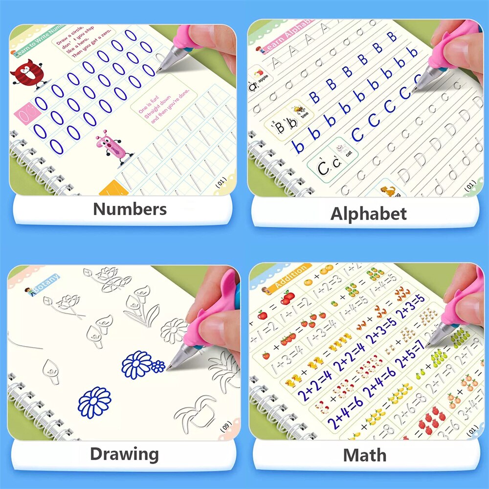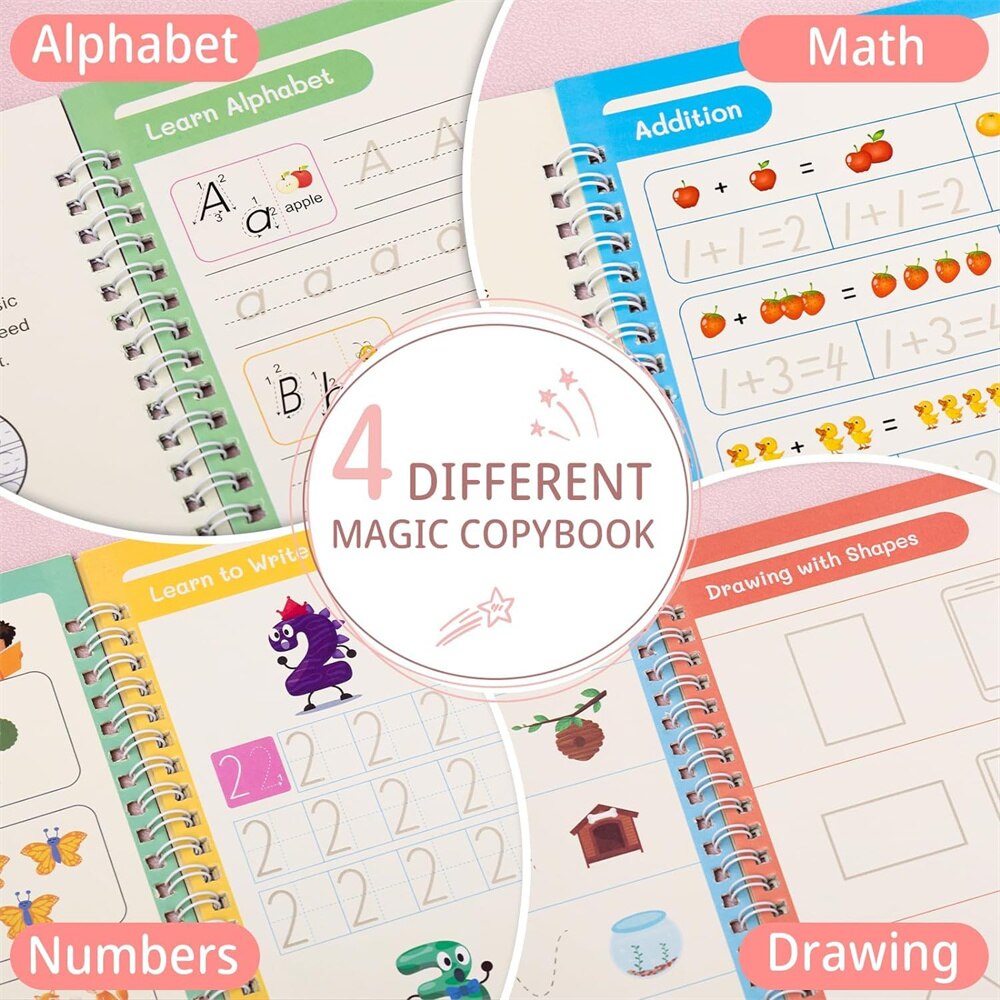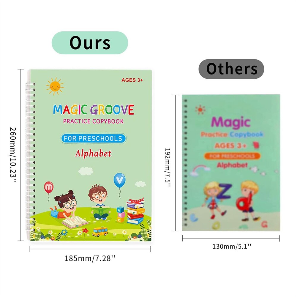 Set 4 Carti de lucru mari reutilizabile pentru scris de mana cu caneluri, Magic Practice Copybook, Practica de scris de mana pentru copii, caligrafie prescolara, 26x18.5 cm