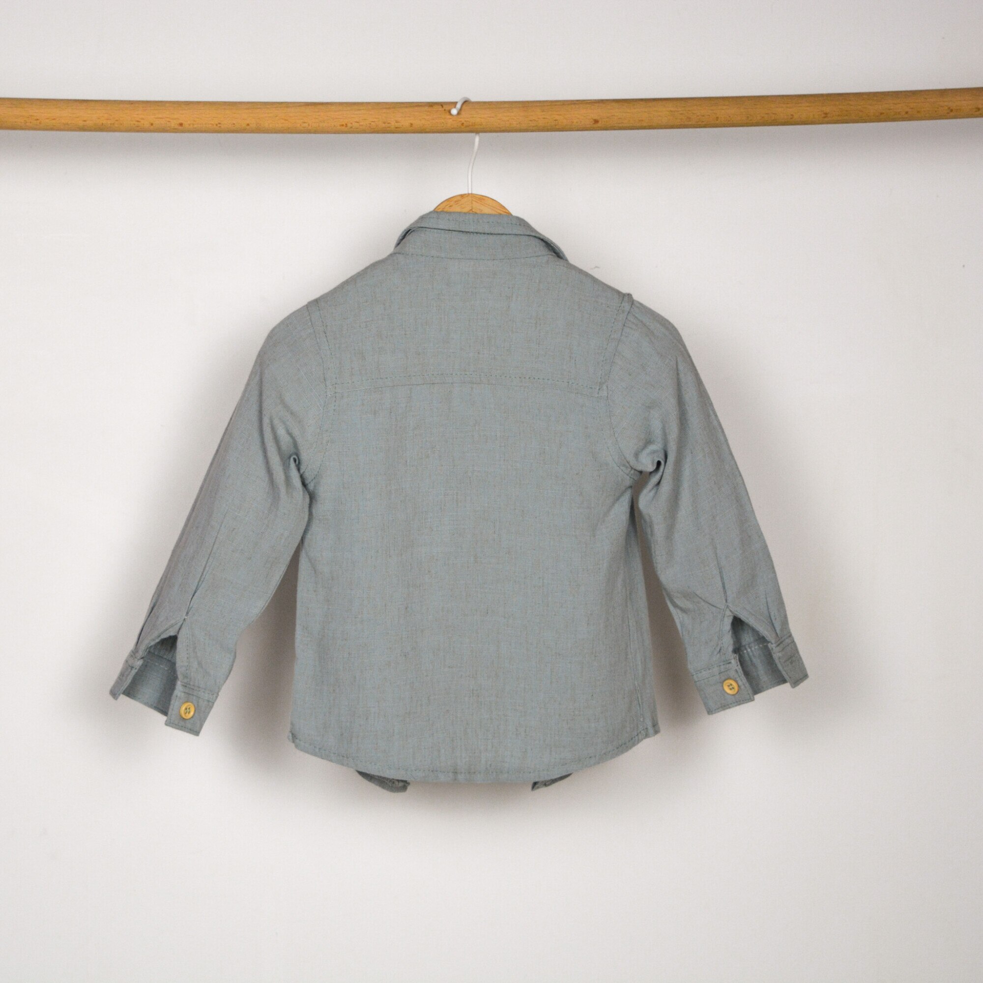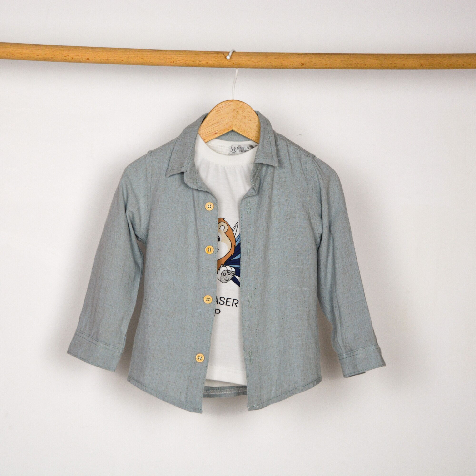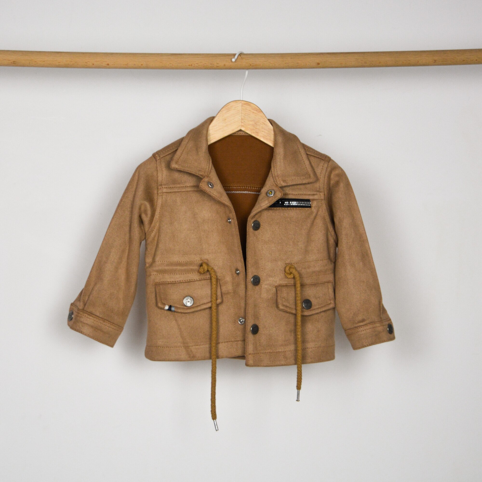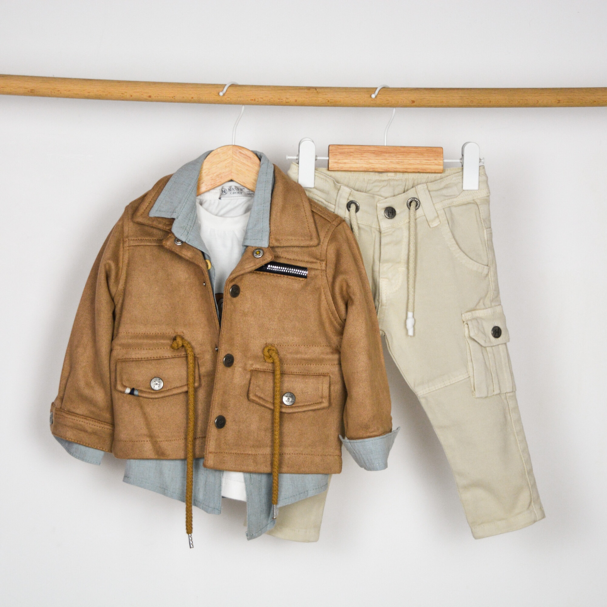 Set 4 piese, pantaloni, camasa, tricou si geaca imitatie piele intoarsa maron, Multicolor