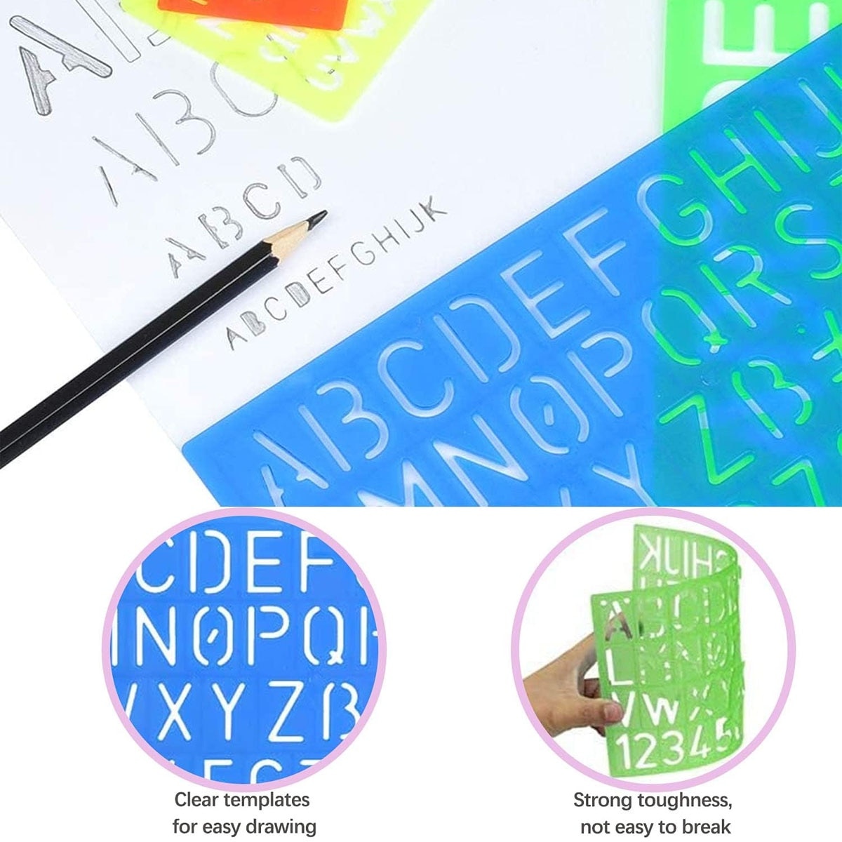 Set 4 sabloane litere si numere din plastic, diverse dimensiuni, culori asortate, 24.5x15.1cm, 19.5x11cm, 14.7x6.3cm, 16x4.4cm