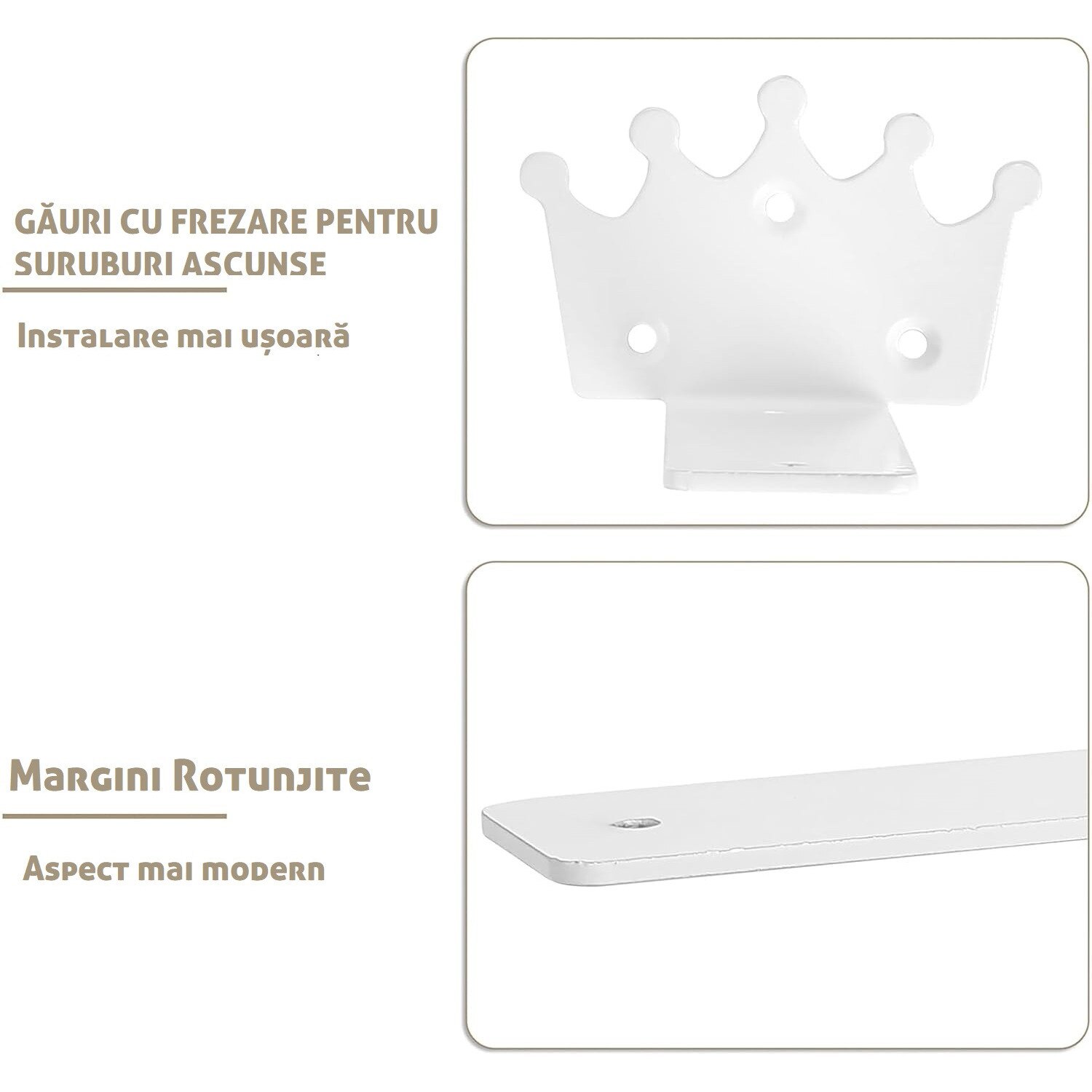 Elementul central al acestor console este placa de baza in forma de coroana. Acest detaliu arhitectural transforma un simplu coltar metalic intr-un accesoriu decorativ de lux.