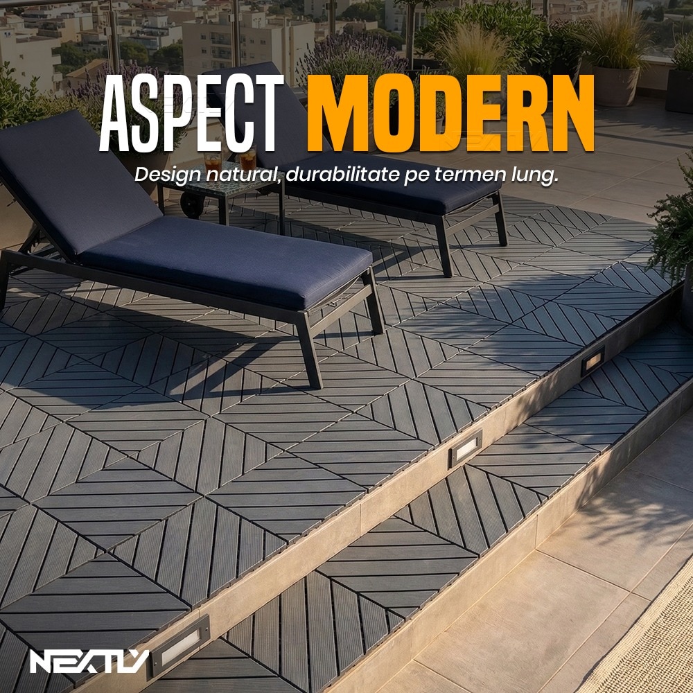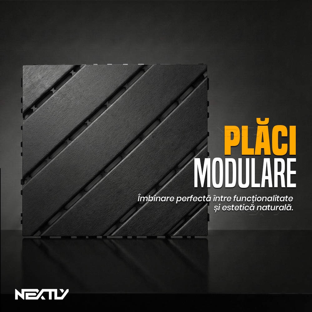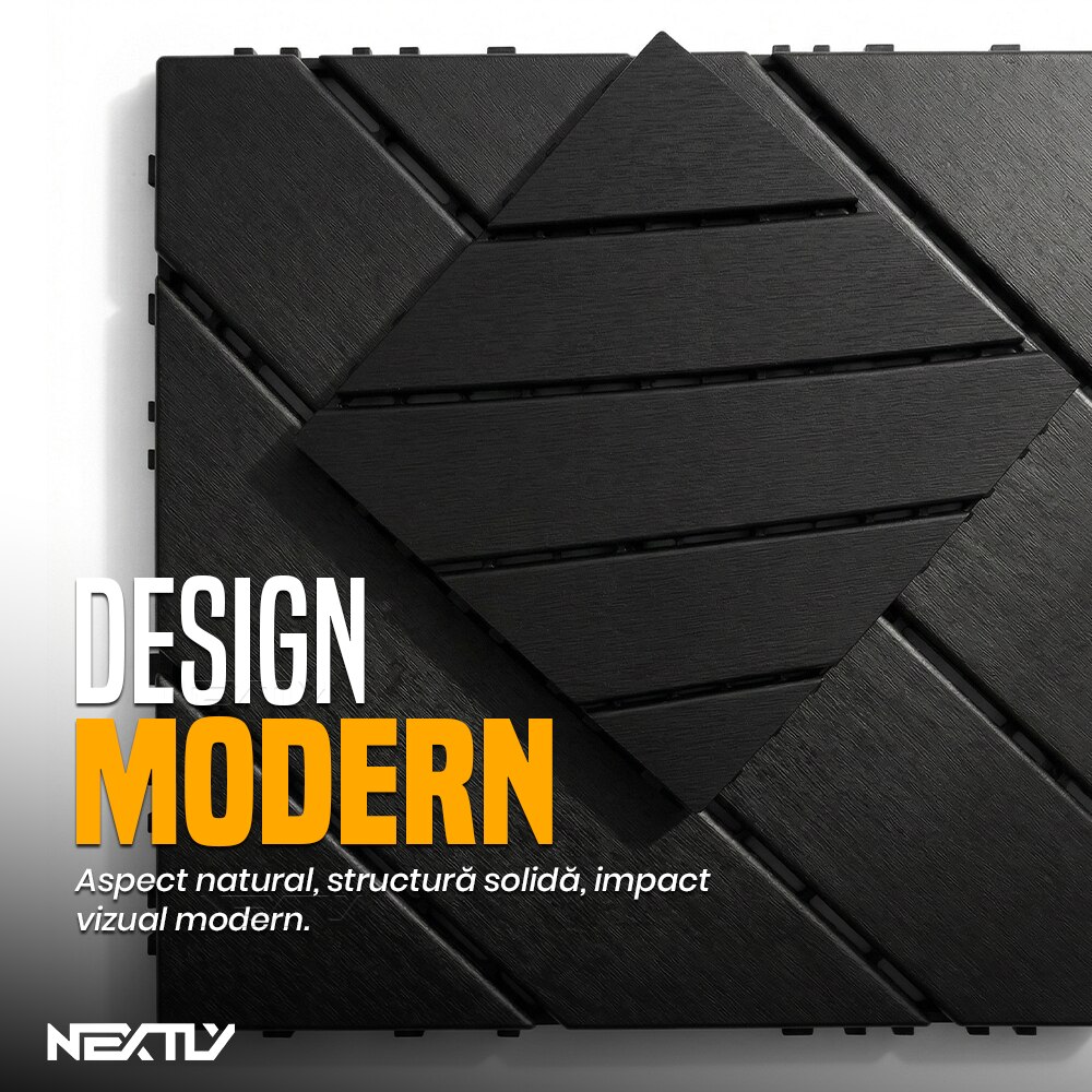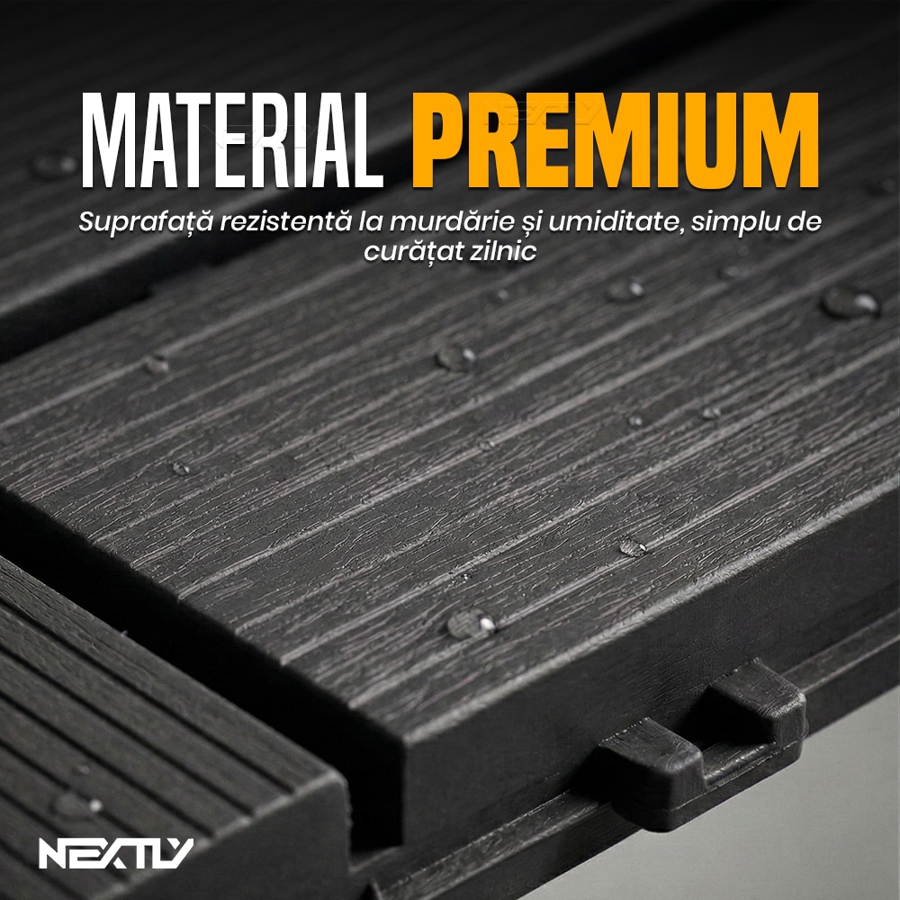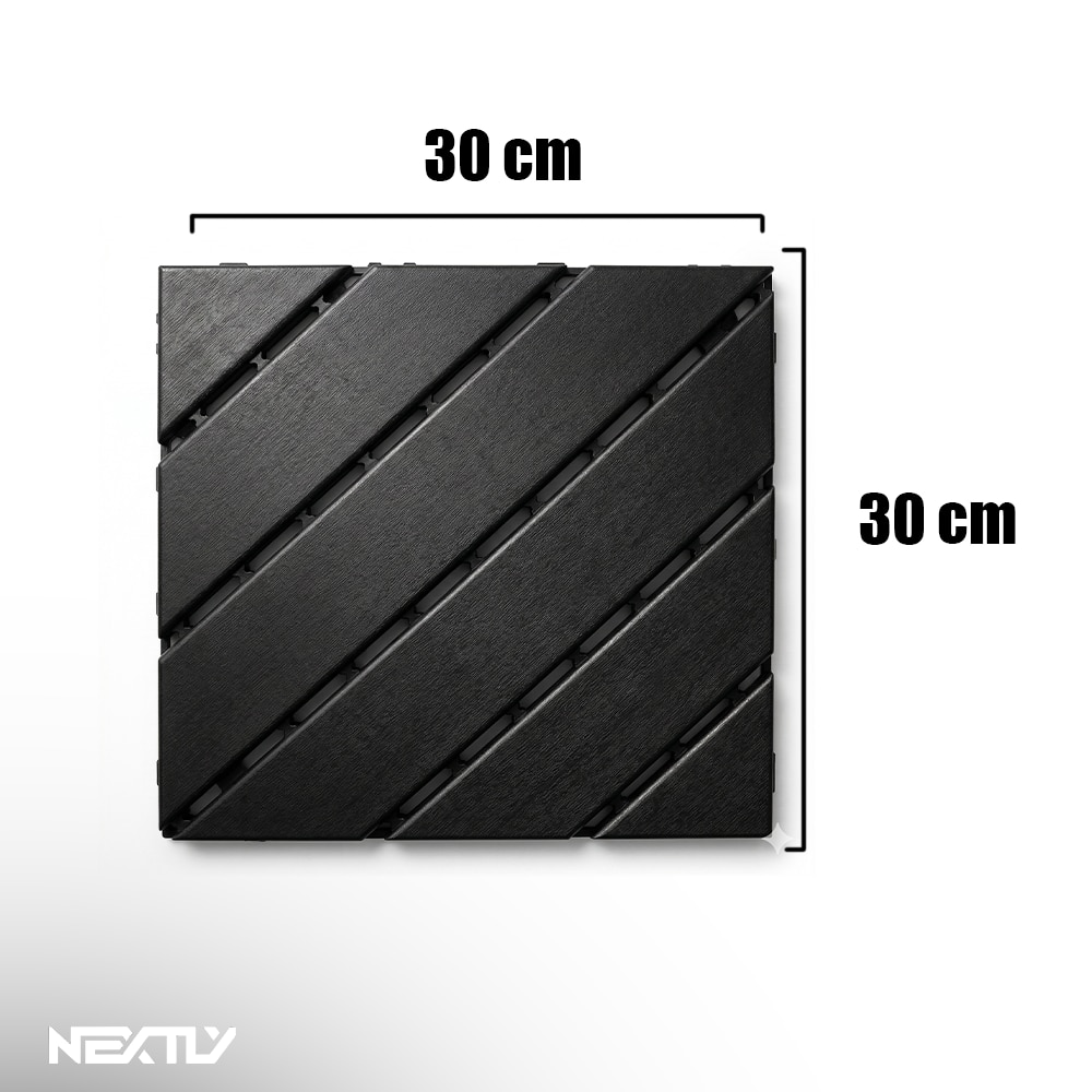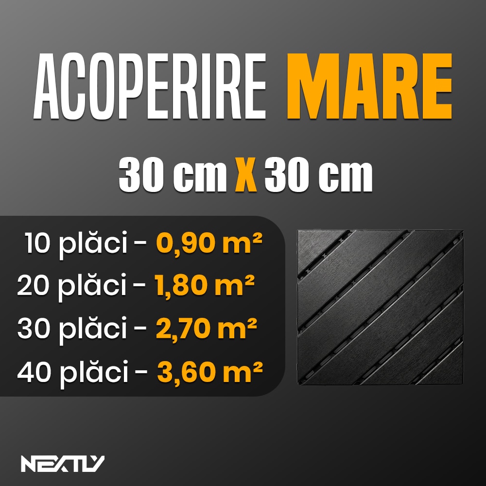 Set 40 x Placi Pardoseala Modulare din PVC tip parchet pentru Terasa NEXTLY, 30x30 cm, sistem click, imitatie lemn, 2 cm grosime, acoperire 3.6 mp, sistem drenaj, rezistente la intemperii, negru antracit