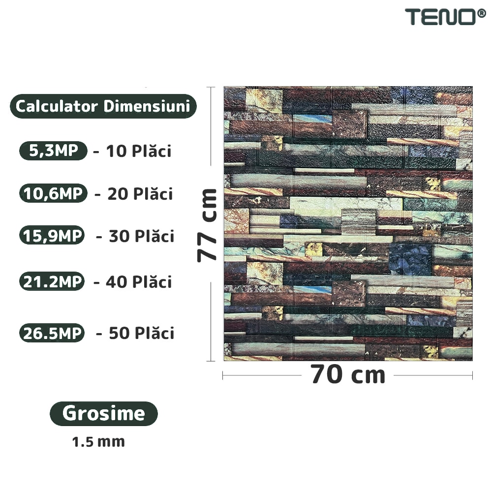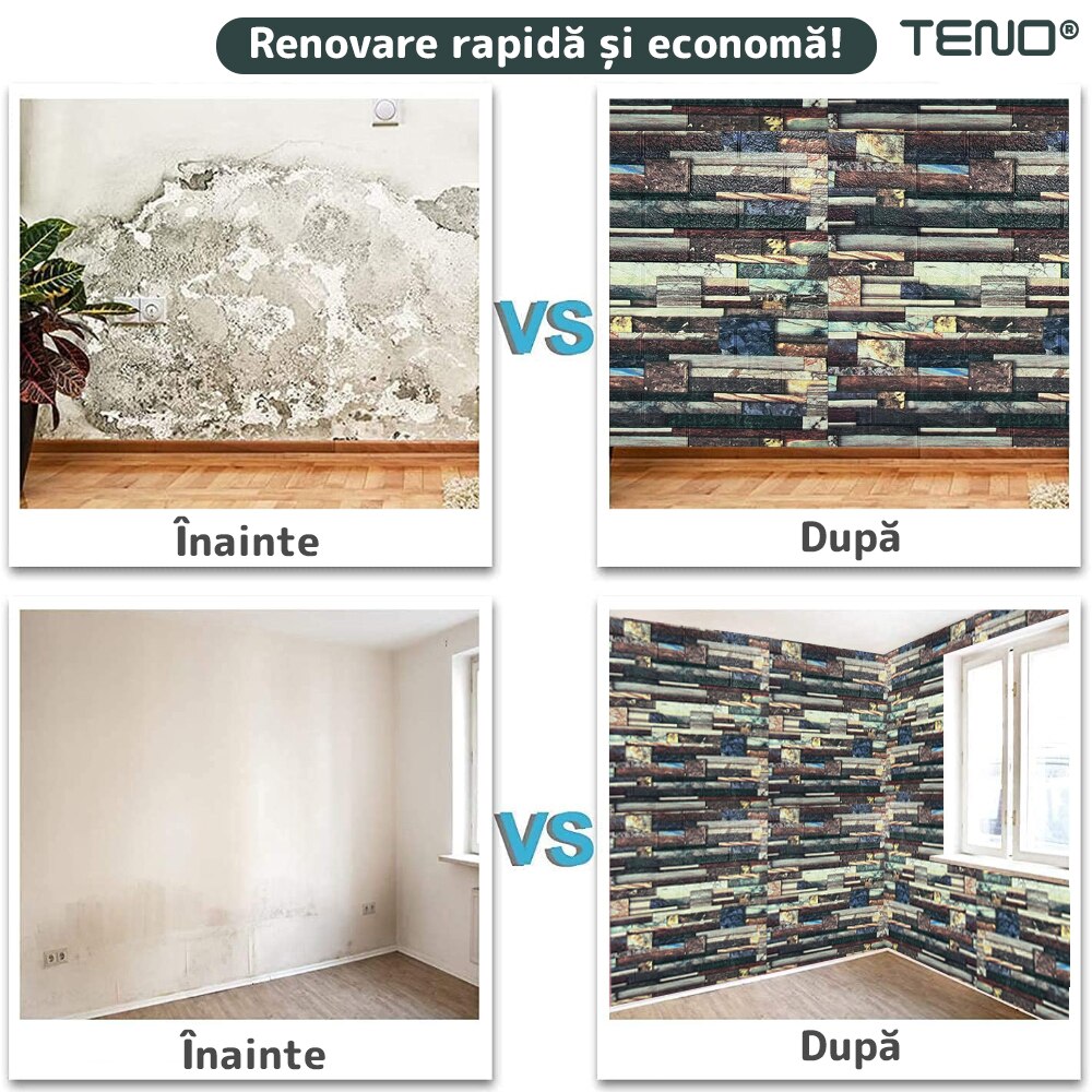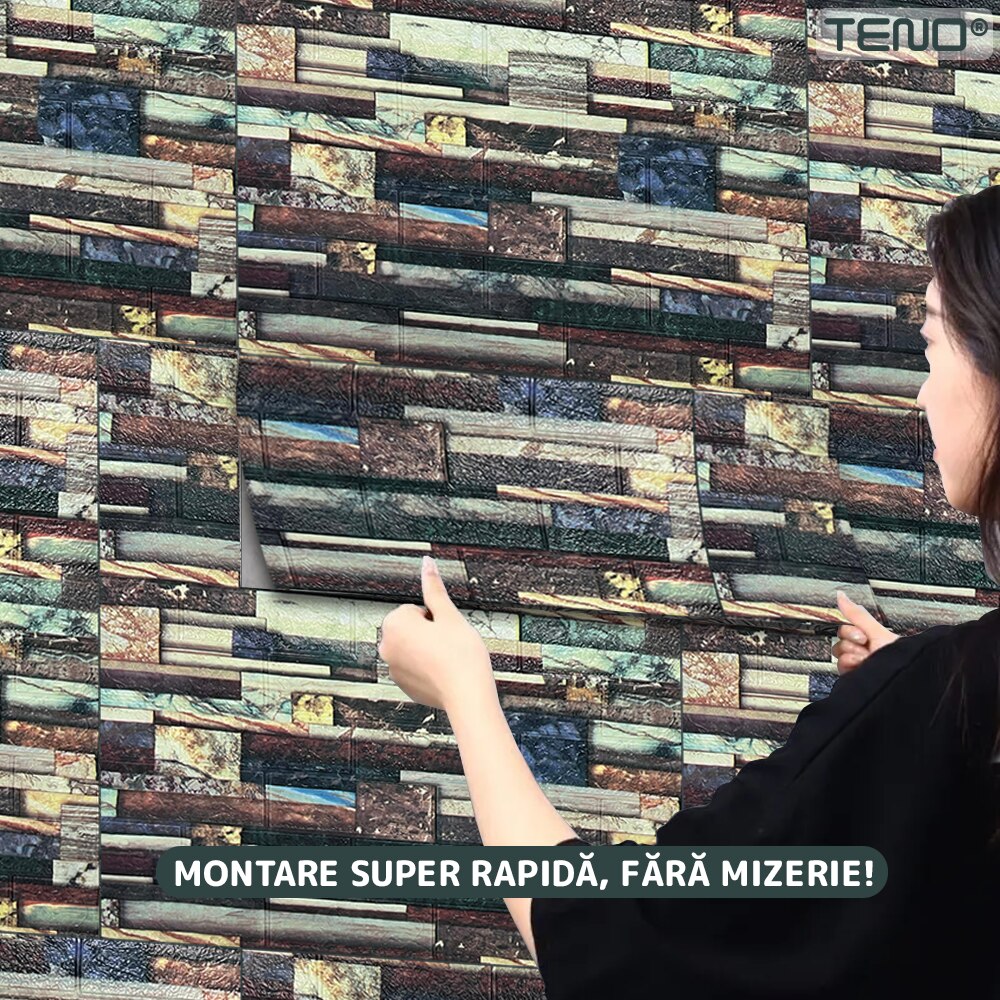 Set 40x Tapet Caramida 3D Teno®, Model Lemn Marmotat, suprafata acoperire 21.2 mp, autoadeziv, waterproof, usor de montat, design modern, 70x77 cm, multicolor
