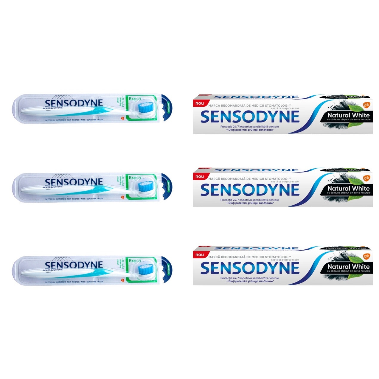 Set 6 x Sensodyne Variety, 3 x Periuta Dinti Multi Care Medium, 3 x Pasta Dinti 75ml Natural White Charcoal, proprietati antimicrobiene puternice, reducerea placa dentara, reduce inflamatia gingivala, respiratie proaspata, proprietati antiseptice