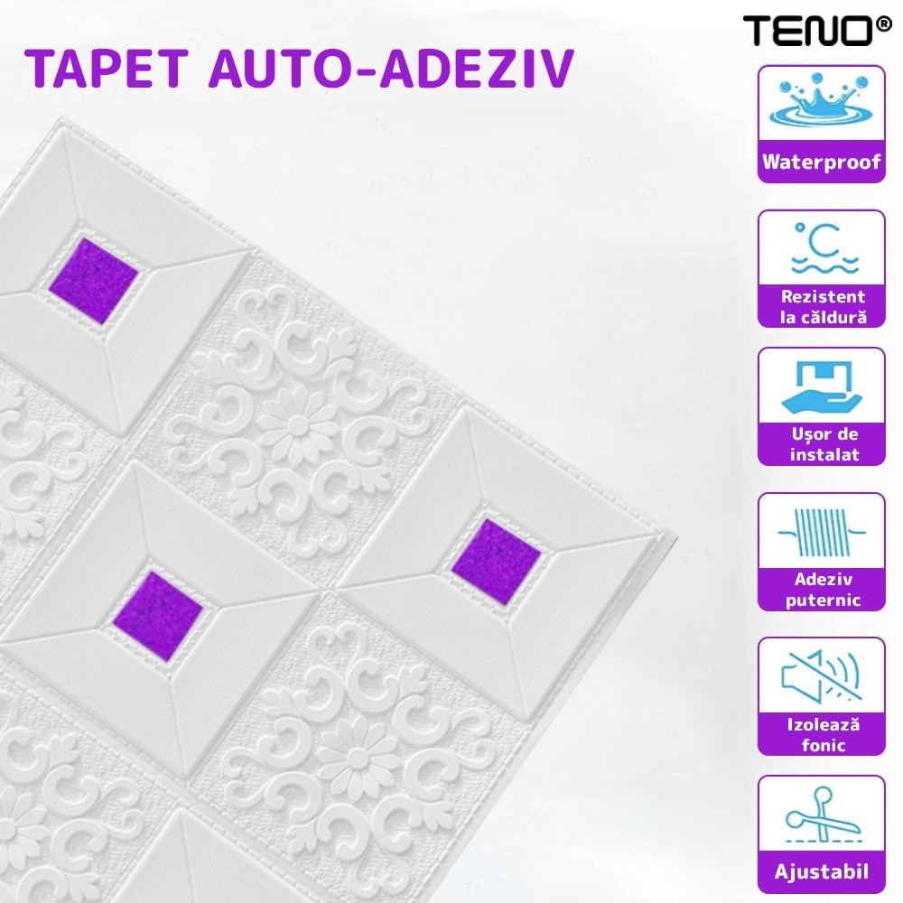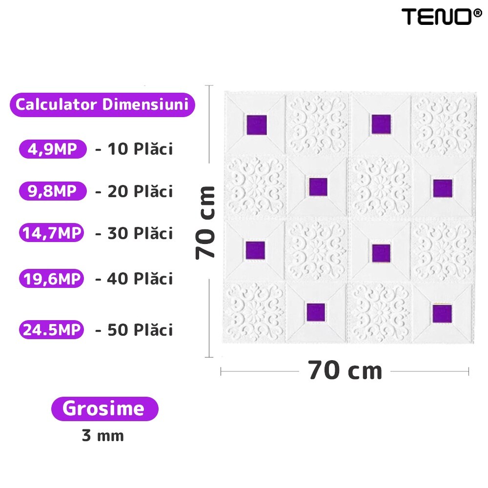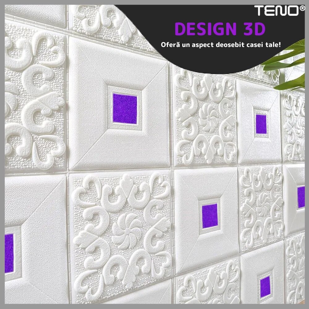 Set 90x Tapet 3D Teno®, suprafata acoperire 44.1 mp, autoadeziv, perete/tavan, waterproof, usor de montat, design modern, 70x70 cm, mov