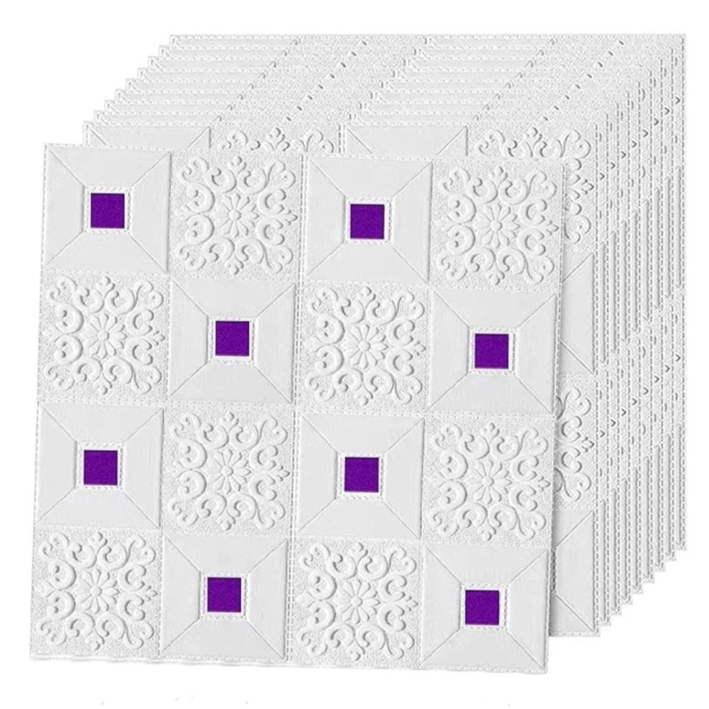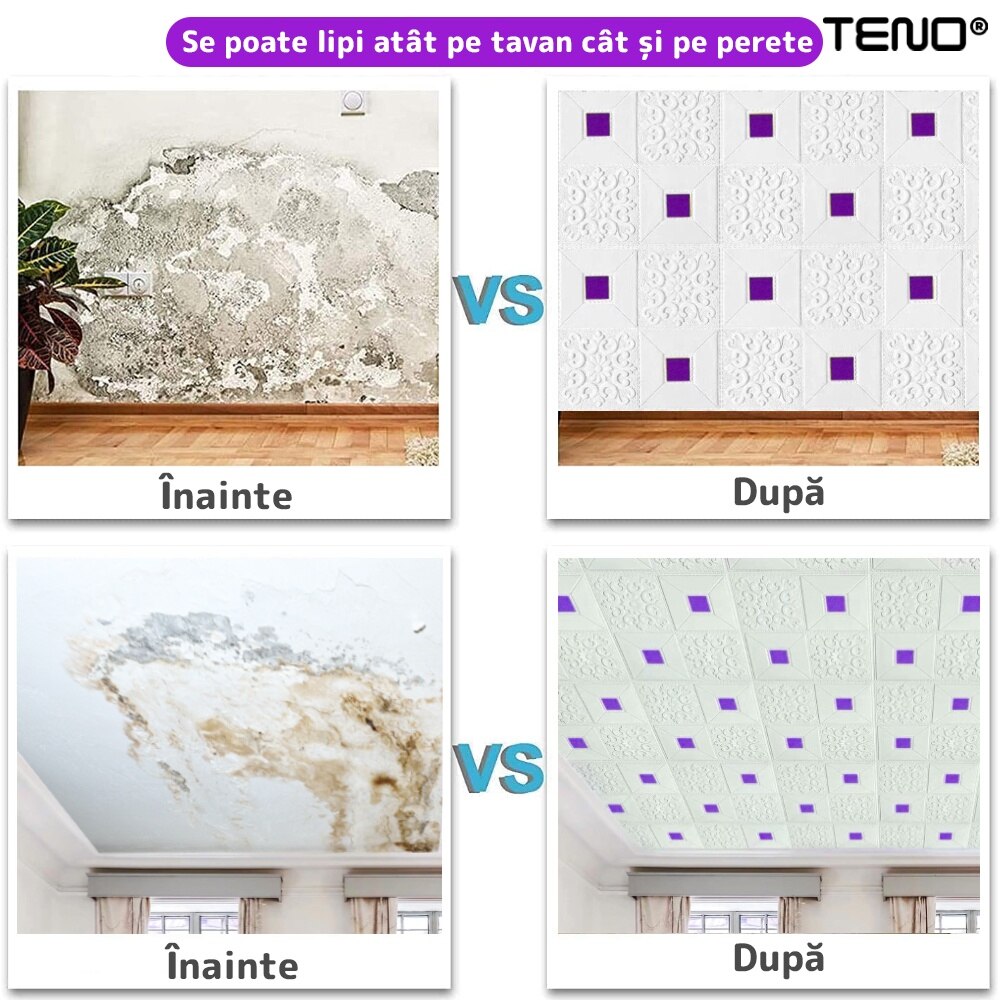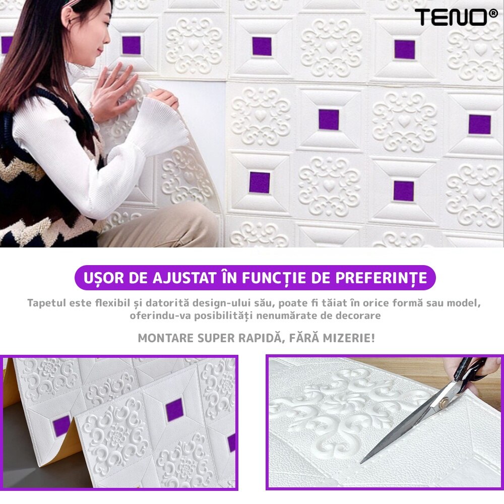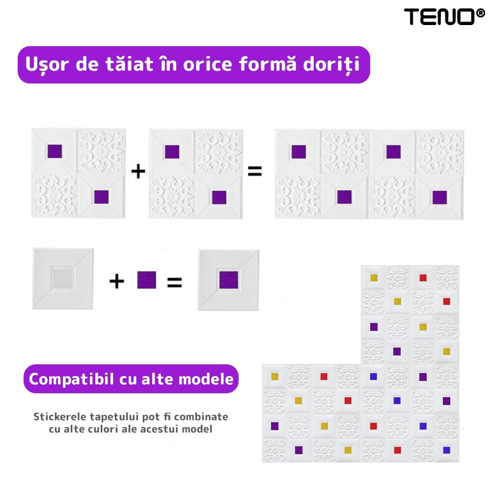 Set 90x Tapet 3D Teno®, suprafata acoperire 44.1 mp, autoadeziv, perete/tavan, waterproof, usor de montat, design modern, 70x70 cm, mov