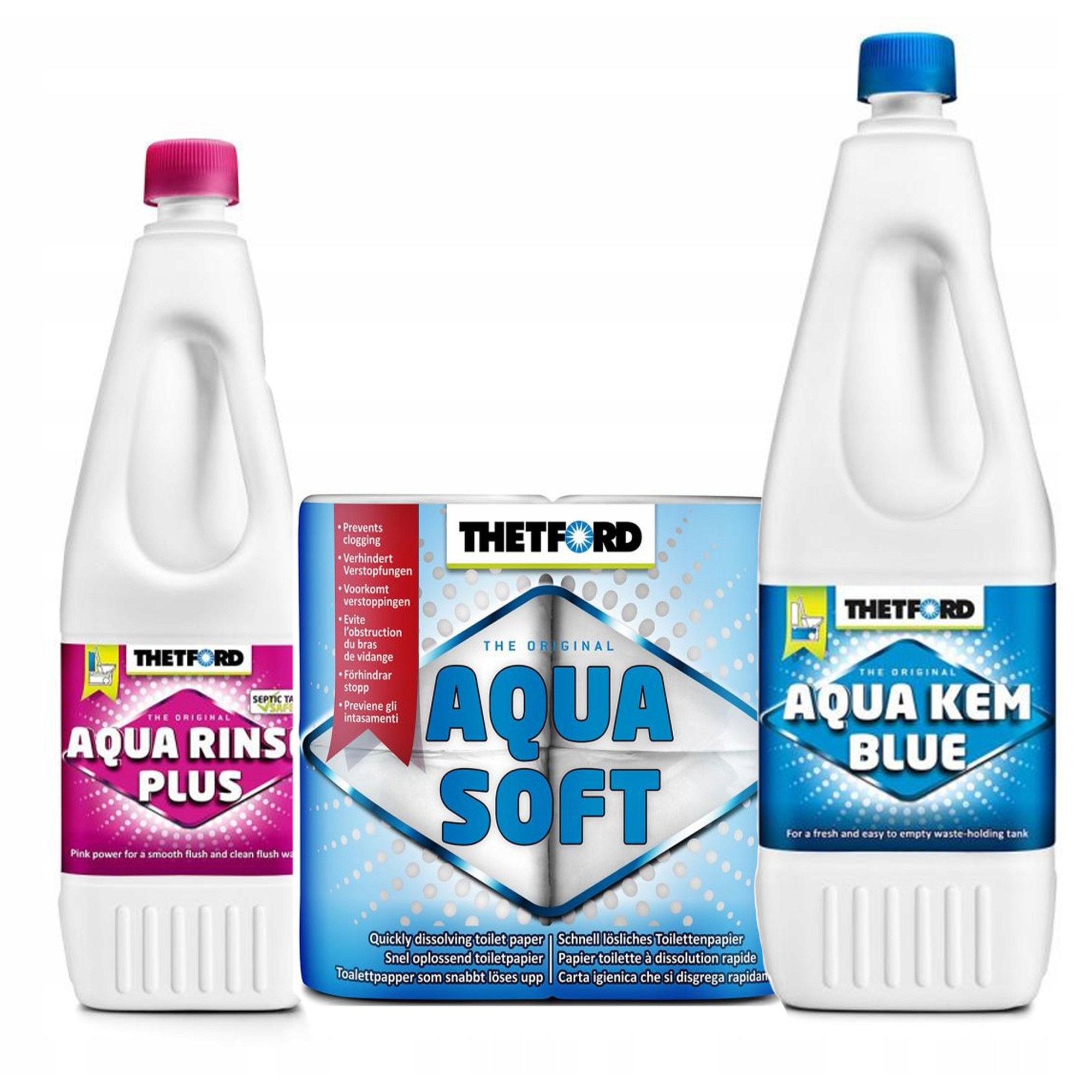 Set lichide pentru toalete chimice Aqua Kem Blue 2L + Aqua Rinse Plus 1.5L marca Thetford + hârtie Thetford