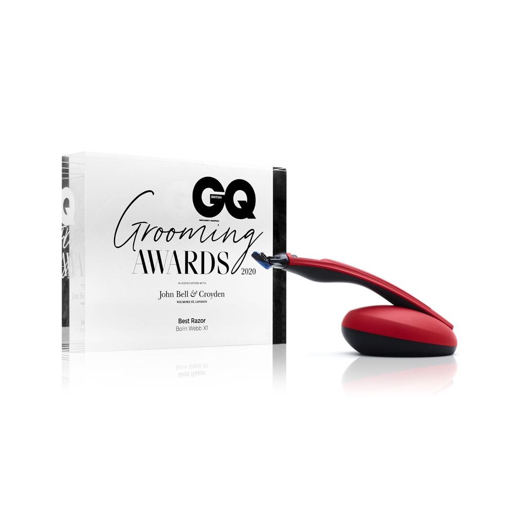 Set aparat de ras cu suport Bolin Webb, X1 Matte Red, compatibil cu lamele Gillette Fusion 5, maner ergonomic, design premium, suport magnetic, carcasa soft touch, barbierit profund, include o rezerva, rosu mat