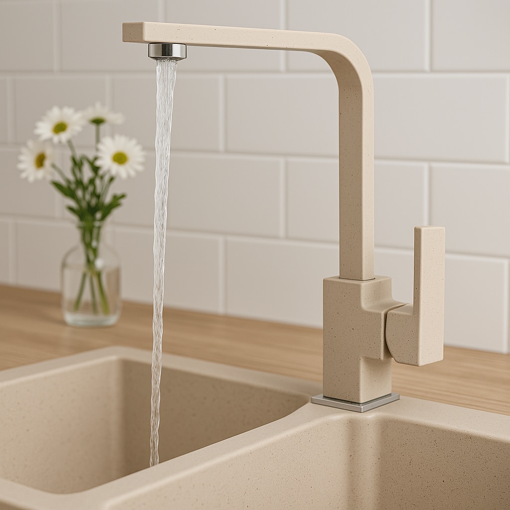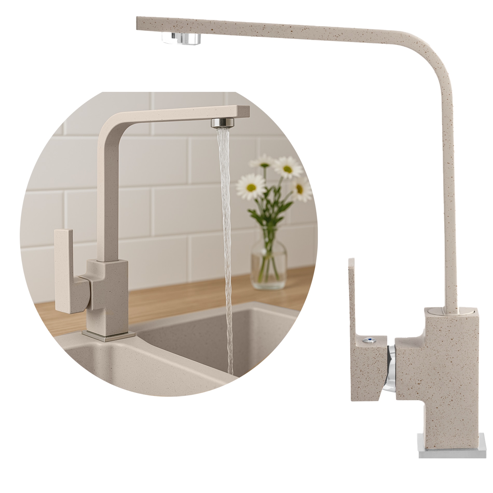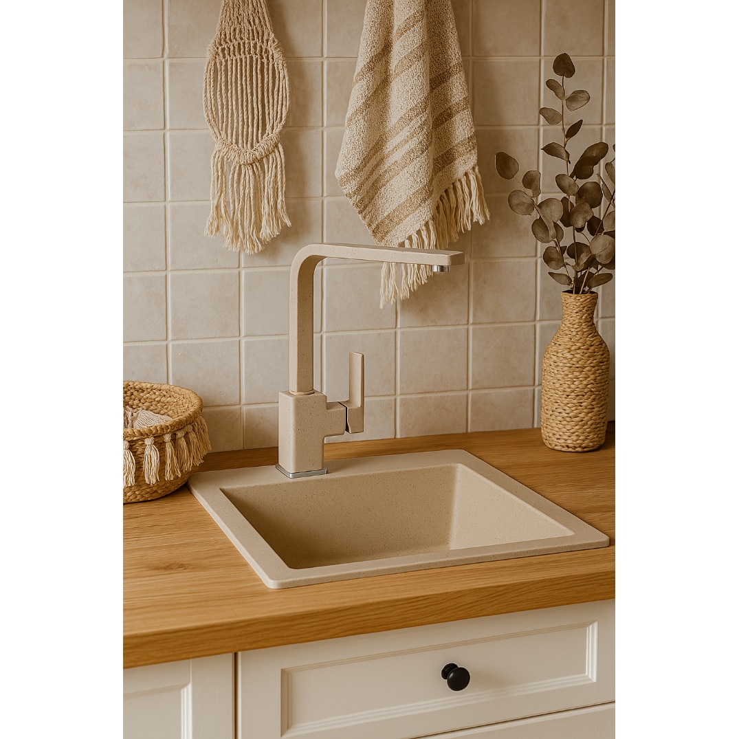 Set baterie de bucatarie cu accesorii, Granitan, 265 mm x 200 mm x 35 mm, Meses, Cap ceramic, Dus rotativ 360°, Acoperire rezistenta la decolorare si temperaturi ridicate, Bej, 2 racorduri flexibile + sistem de prindere