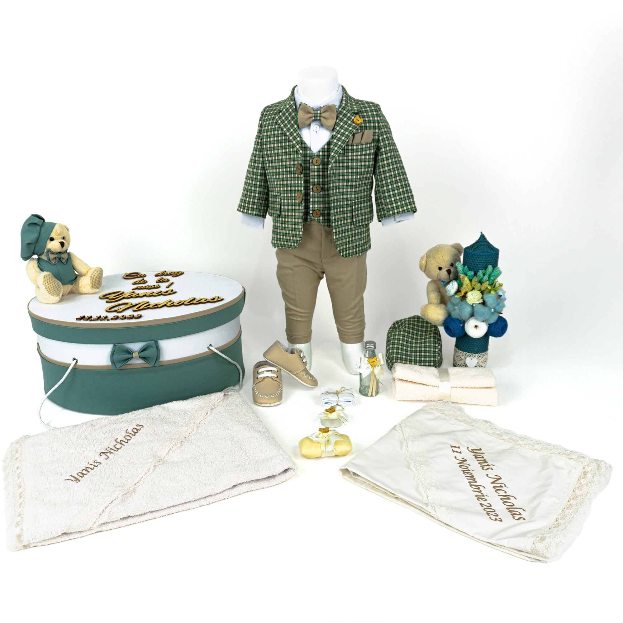 Optiune de Personalizare: Cufarul trusoului si produsele din interiorul cufarului pot fi personalizate cu numele bebelusului si/sau data botezului, pentru a adauga un detaliu unic si memorabil. Dupa plasarea comenzii, te vom contacta pentru a confirma detaliile personalizarii.