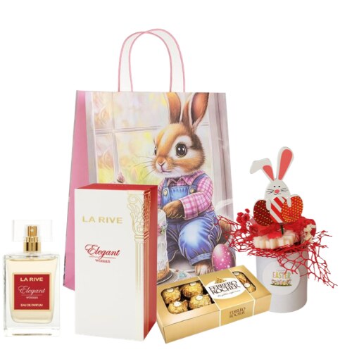 Set Cadou Femei Parfum La Rive Elegant Woman 90 ml, Ferrero Rocher, Iepuras Decorativ, Punga Cadou – Cadou Special pentru Ea