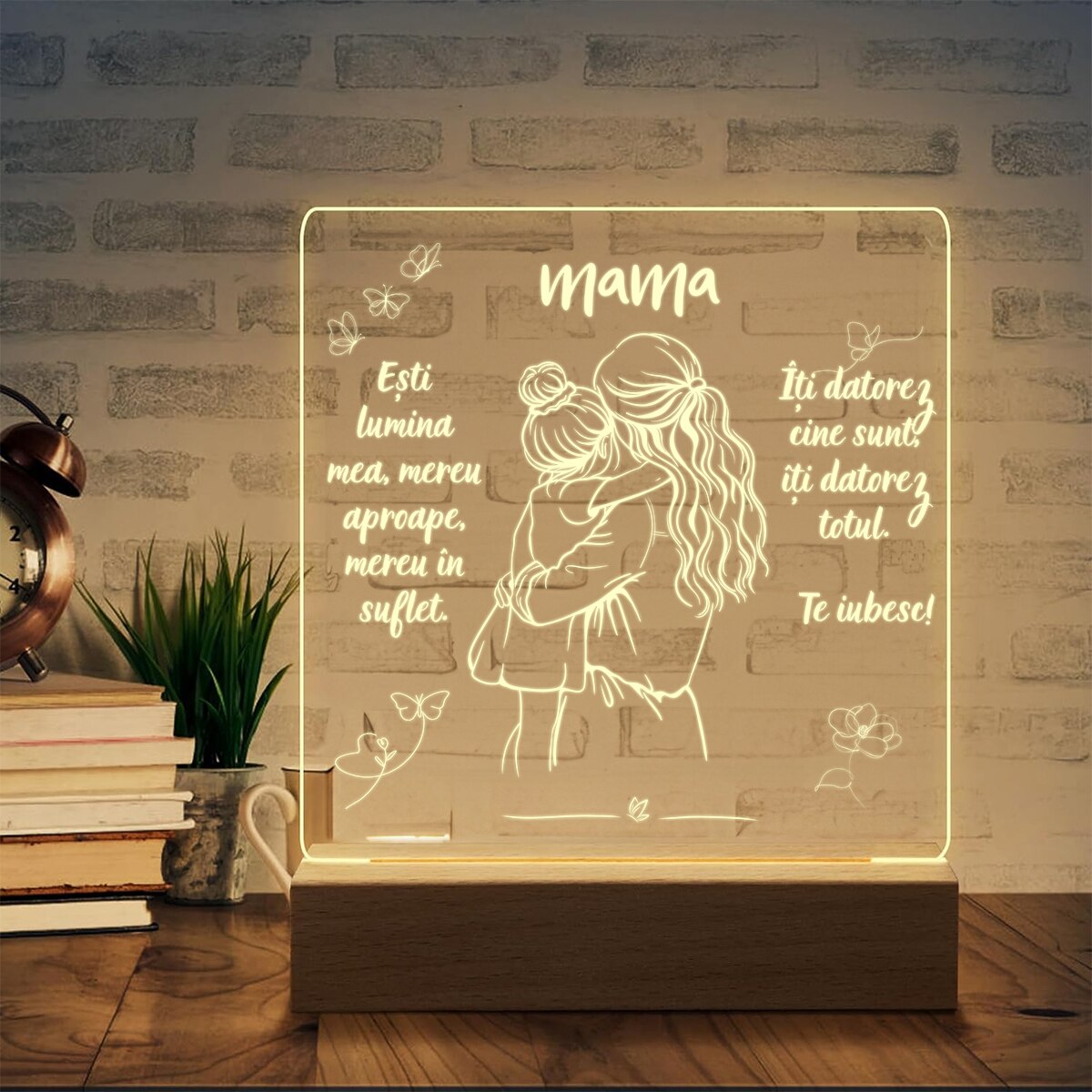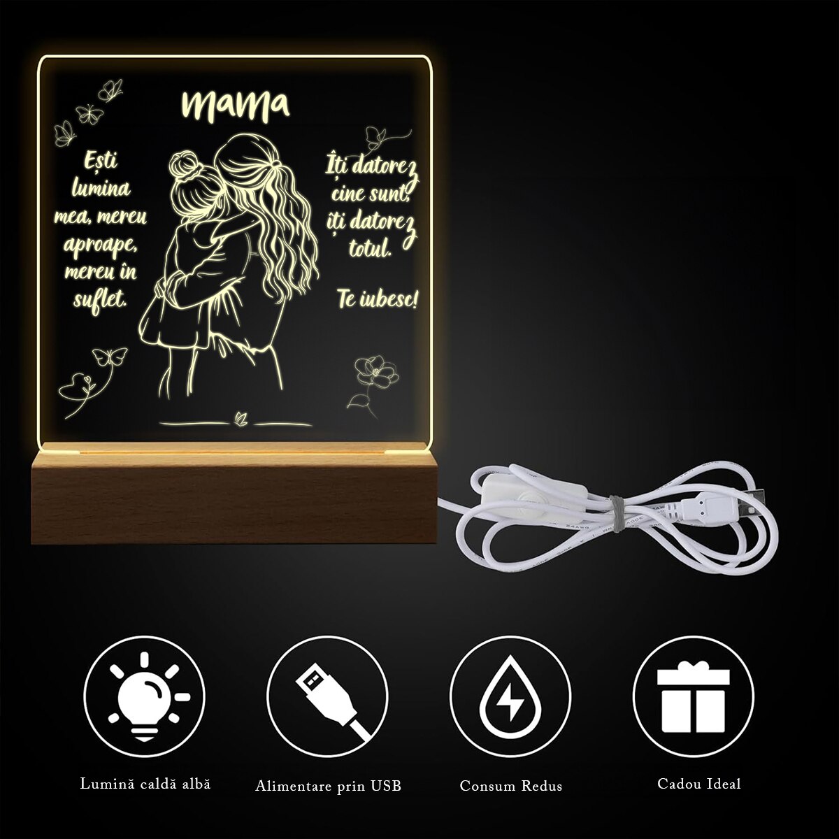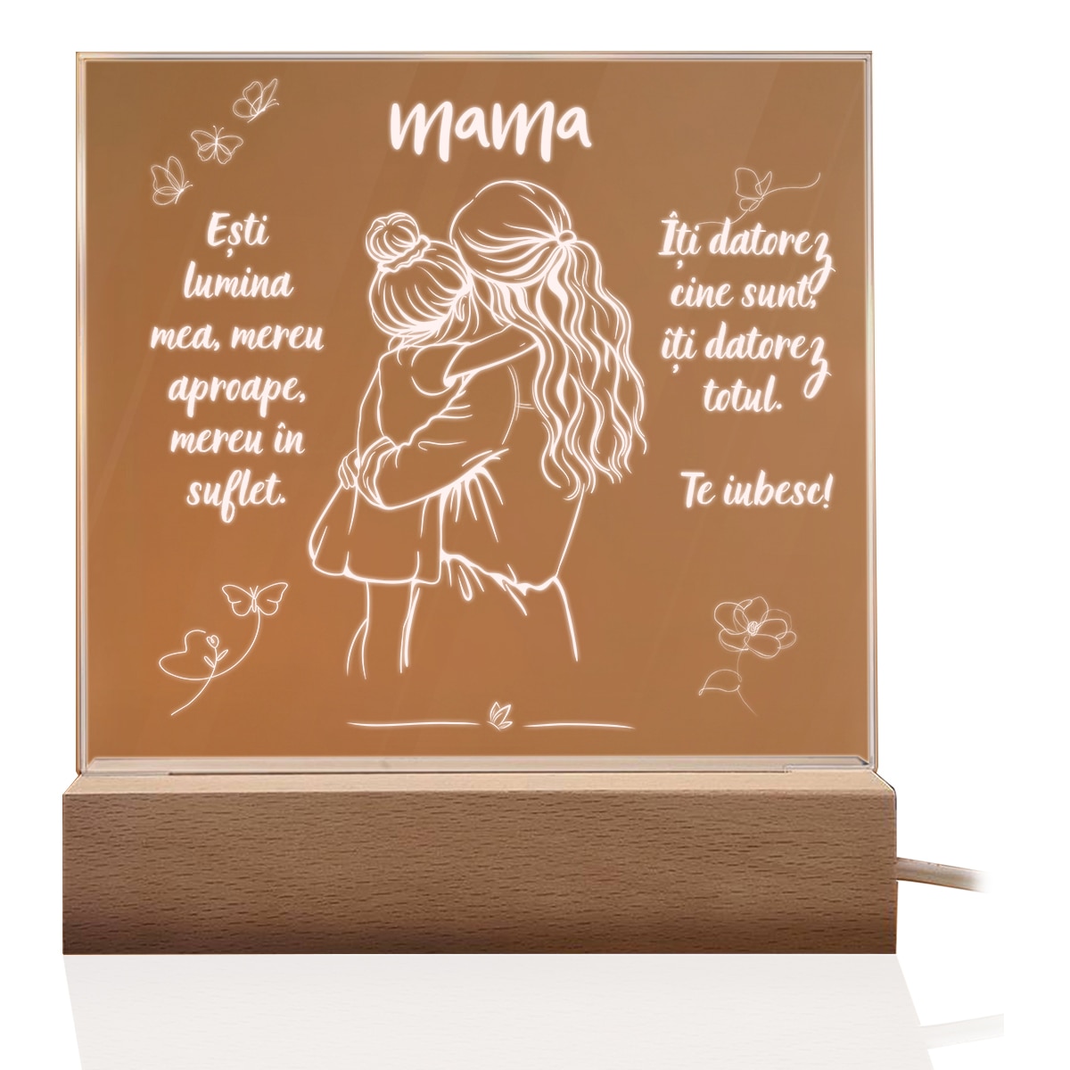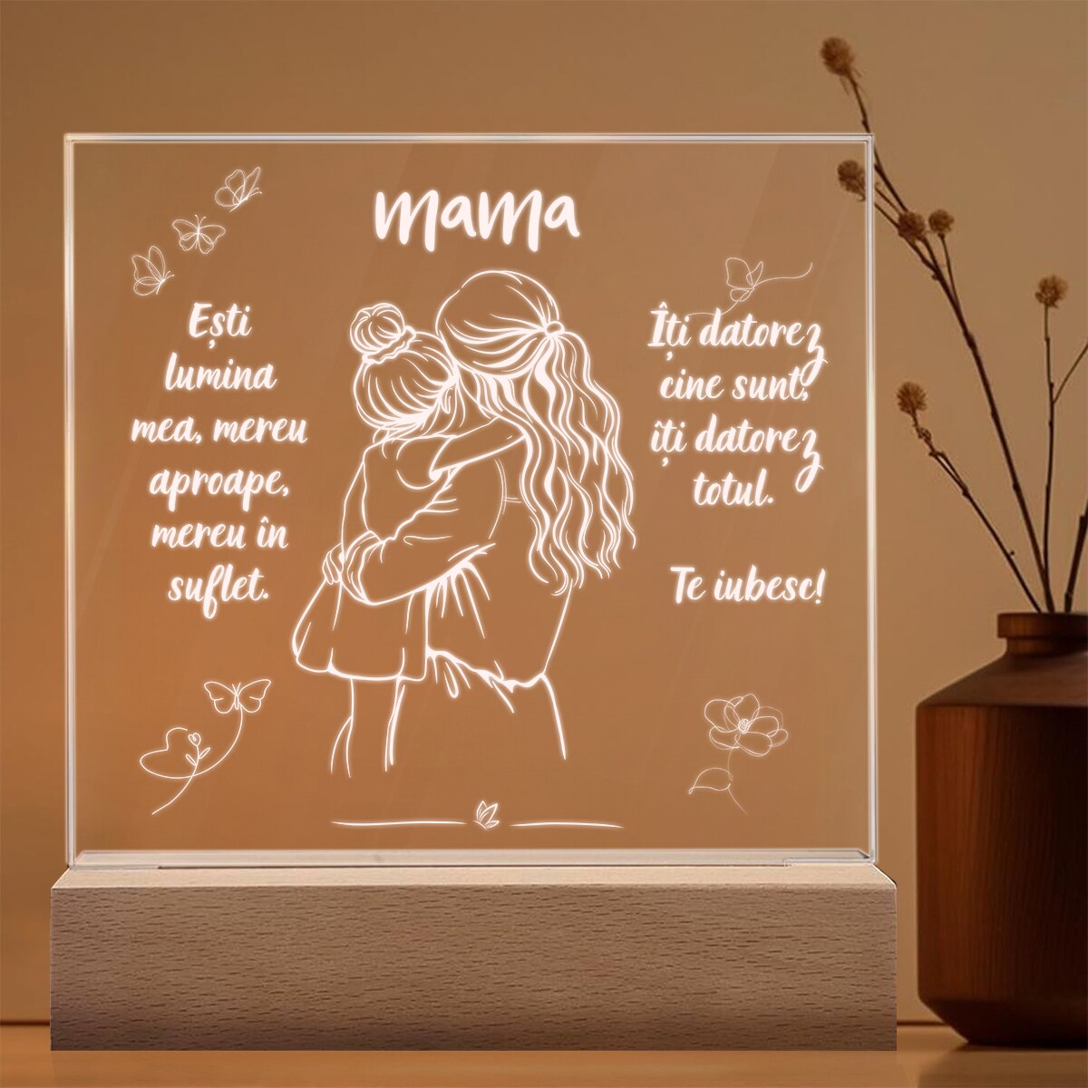 Set Cadou Pentru Mama. Joystos, Lampa Acril cu Mesaj „Esti lumina mea, mereu aproape, mereu in suflet. Te Iubesc” Si Card Razuibil