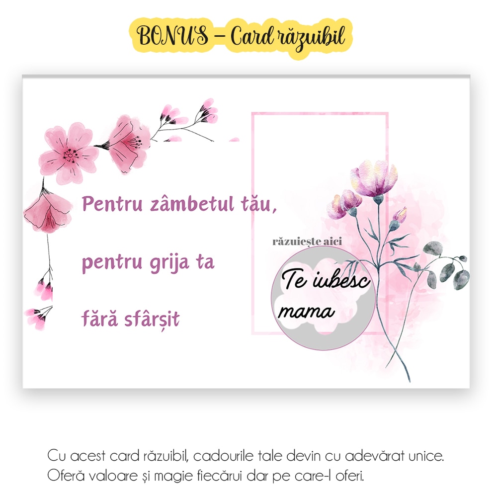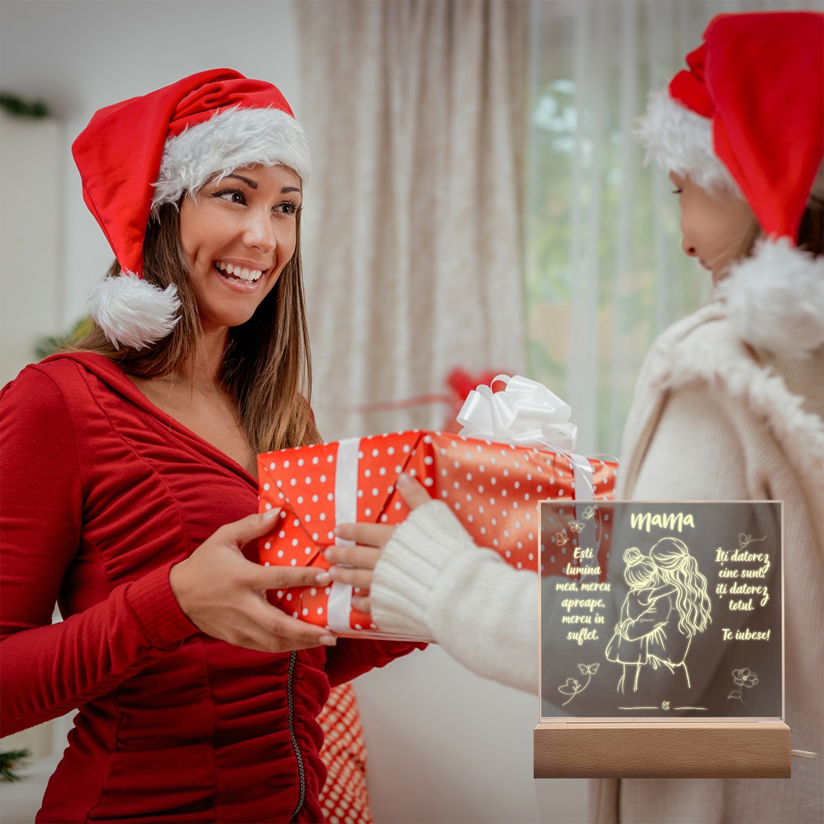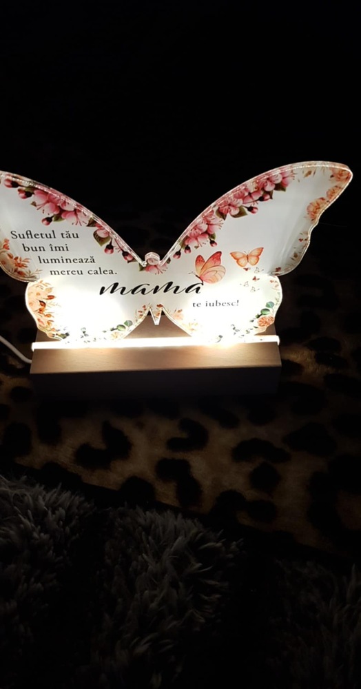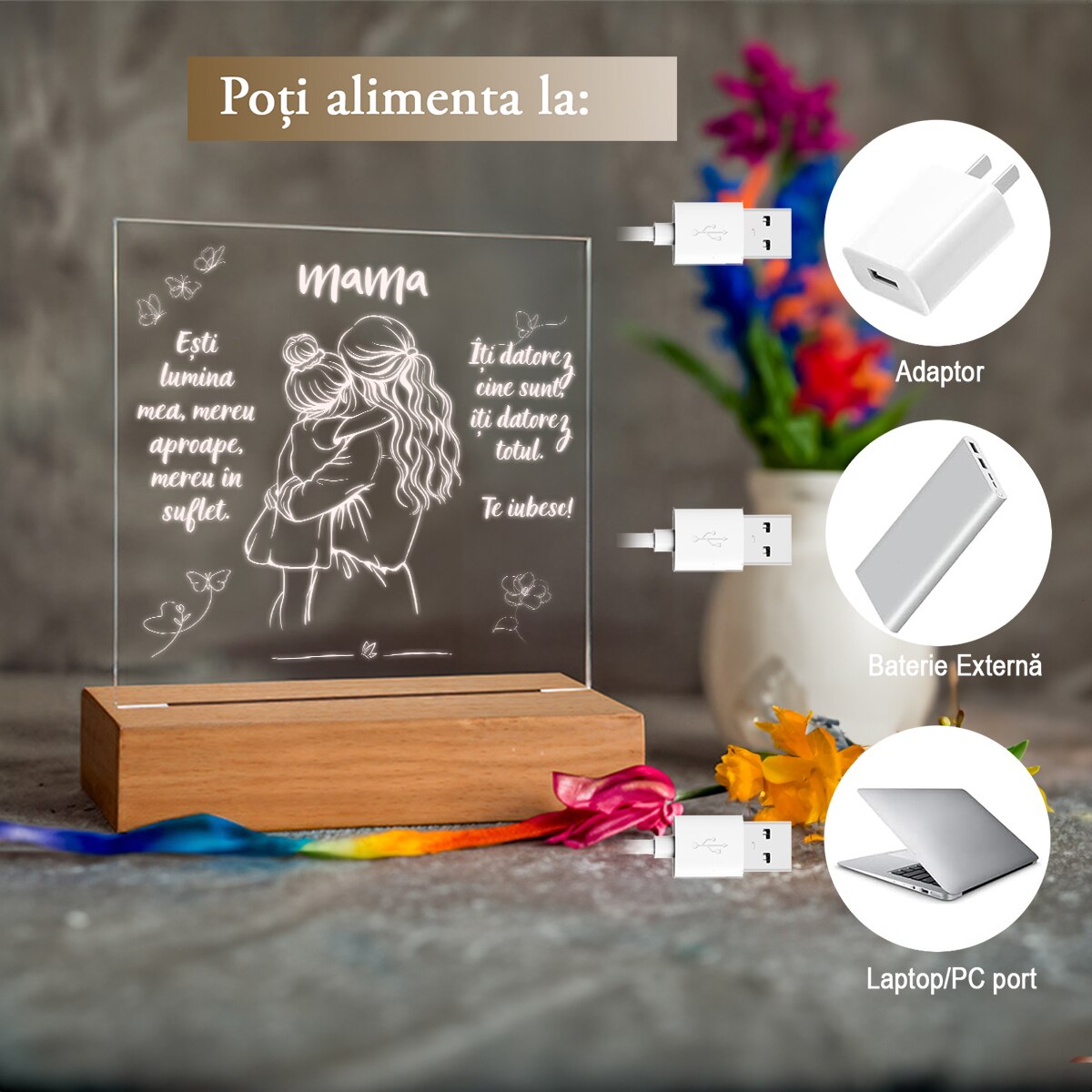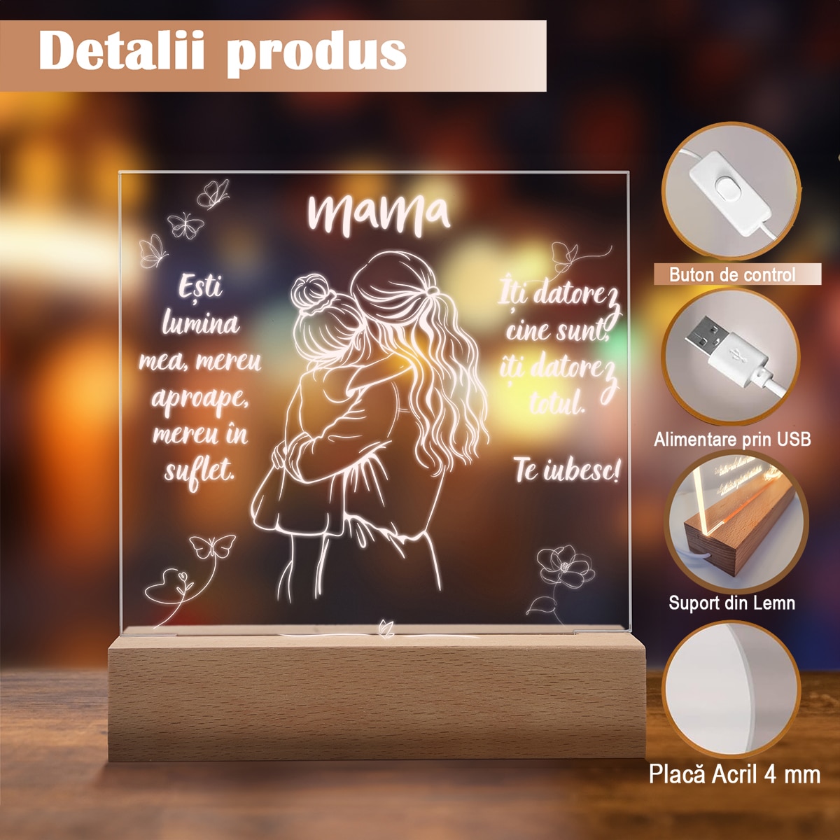 Set Cadou Pentru Mama. Joystos, Lampa Acril cu Mesaj „Esti lumina mea, mereu aproape, mereu in suflet. Te Iubesc” Si Card Razuibil