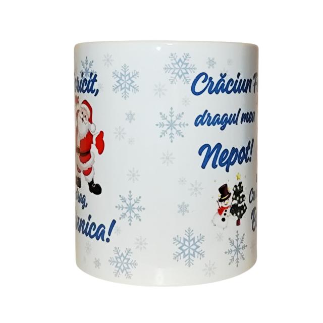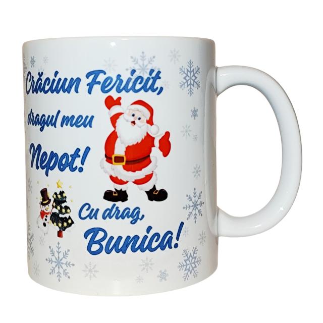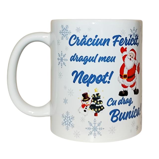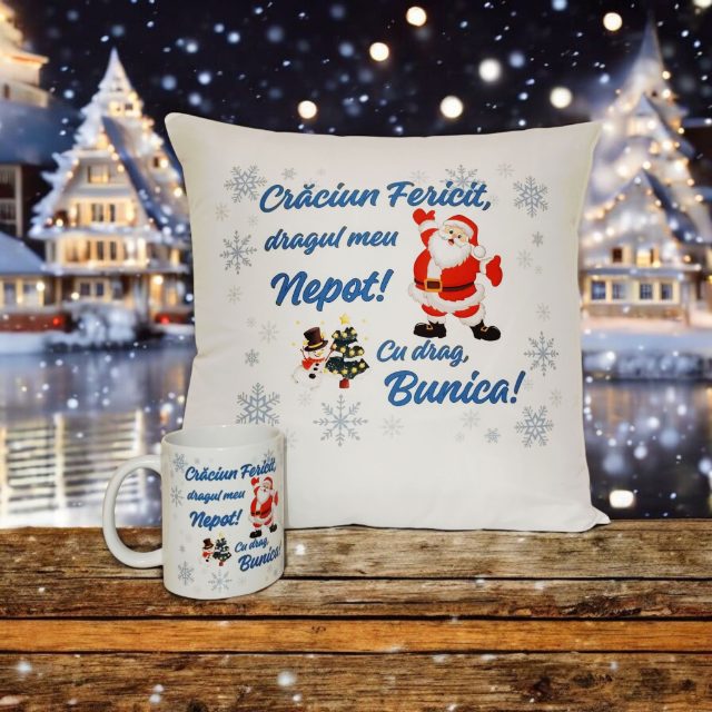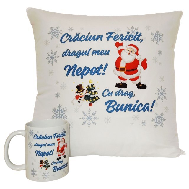 Set Cadou Personalizat - Perna si Cana ''Craciun Fericit, dragul meu Nepot! Cu drag, Bunica! perna 40x40 cm, cana 330 ml