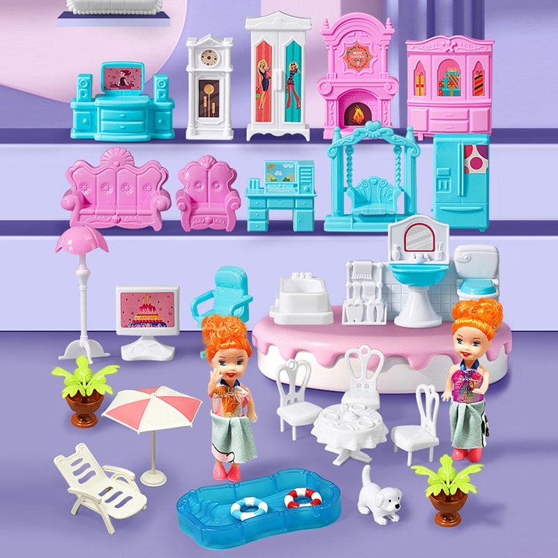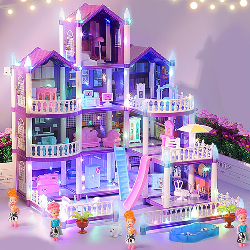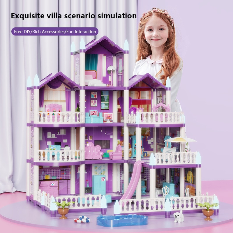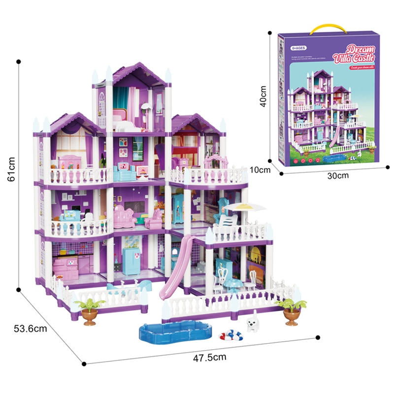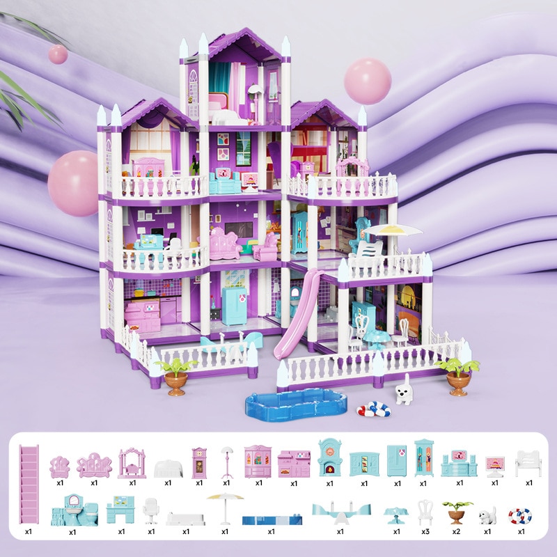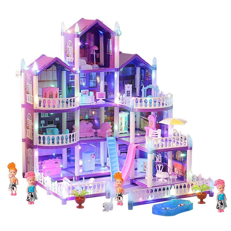 Set casa de papusi pentru fete, Momcbebe, 4 etaje, 13 camere, efect luminos, 4 papusi, 47.5x53.6x61cm, mov