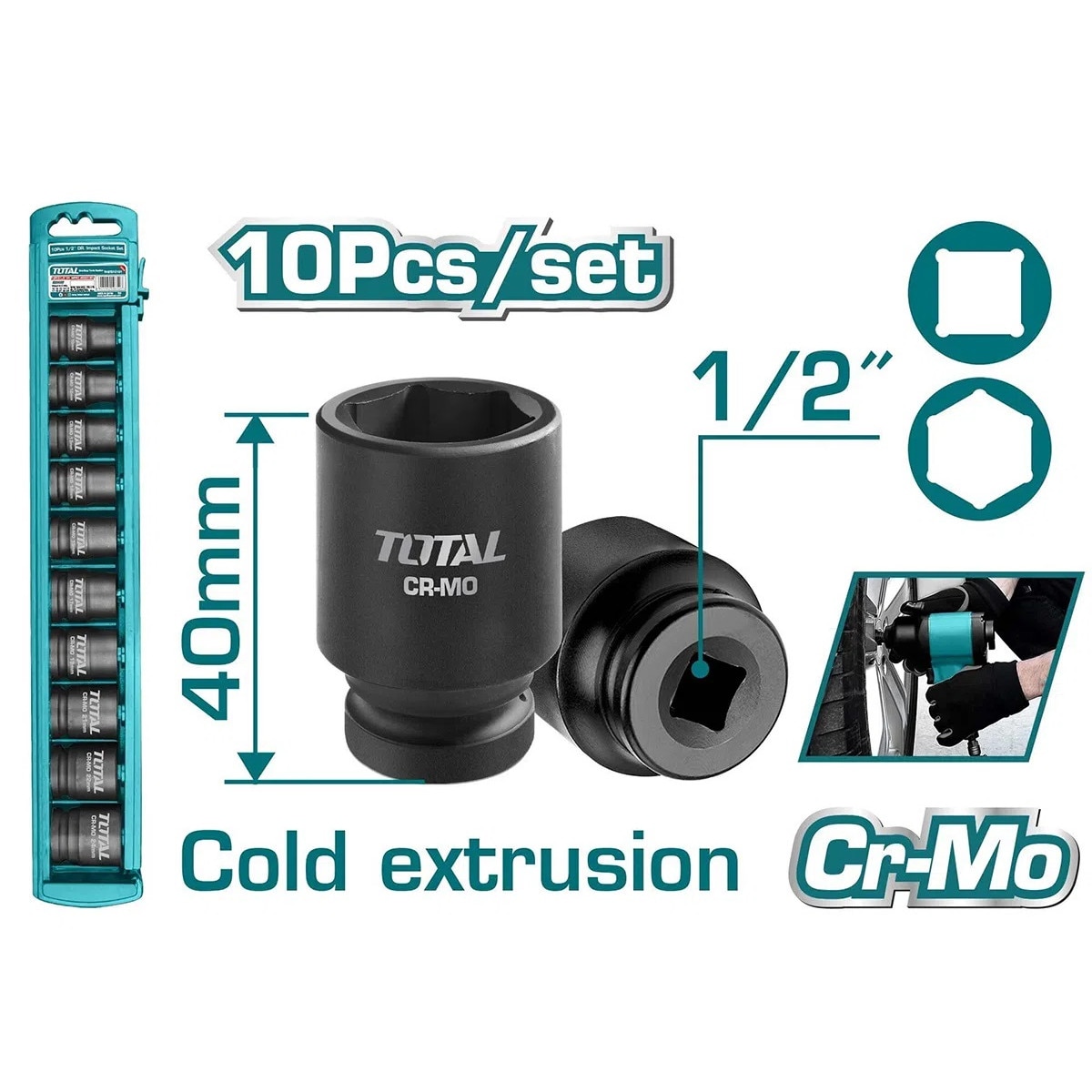 Set chei tubulare de impact Total, 10 buc, 10mm, 12mm, 13mm, 14mm, 15mm, 17mm, 19mm, 21mm, 22mm, 24mm, 1/2