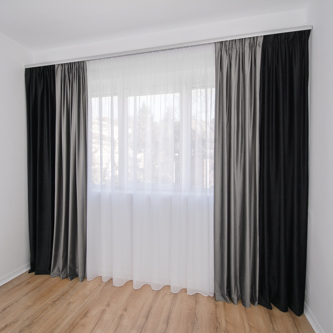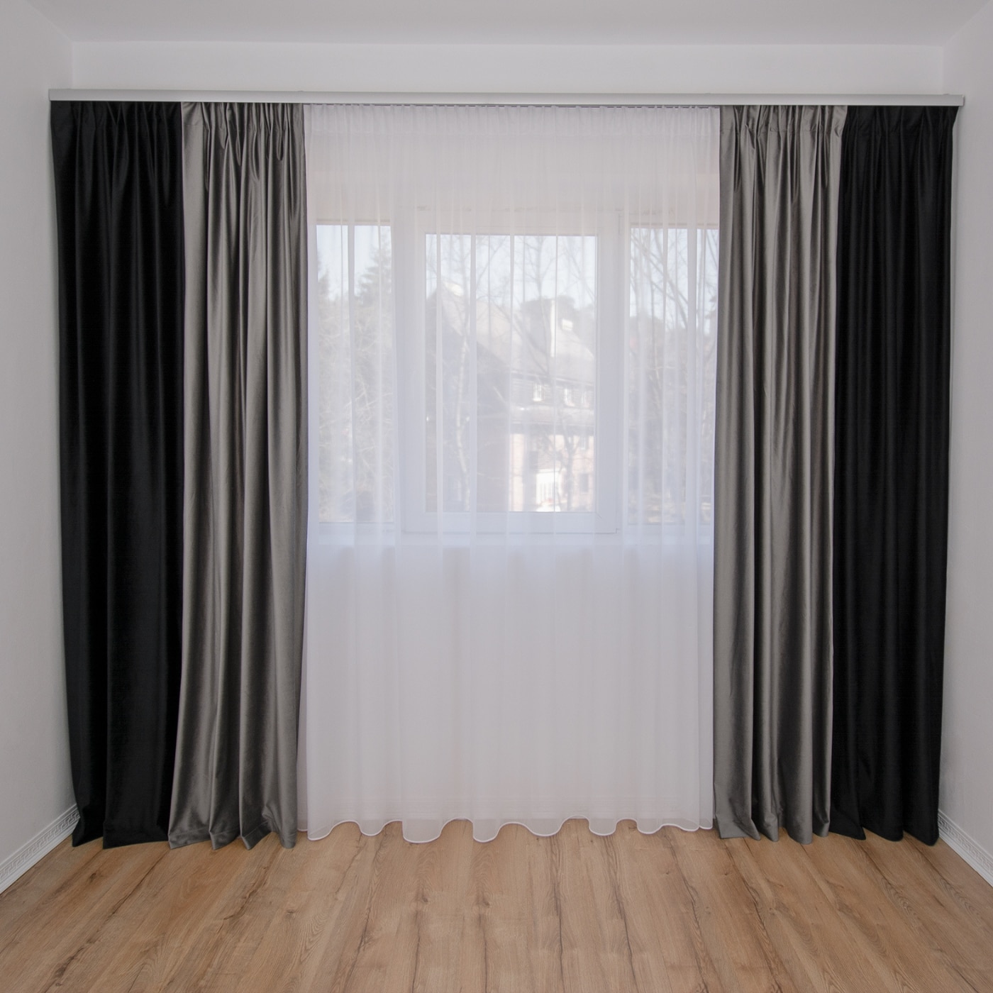 Set Complet Decolis, Draperie Catifea in Doua Culori Vertical, Gri /Negru 2 buc x 275 cm, cu Perdea Triplu Voal Alb 1 buc x 800 cm, H-250 cm