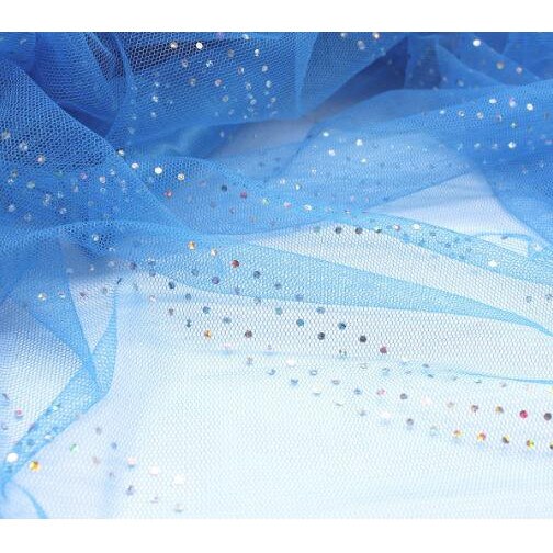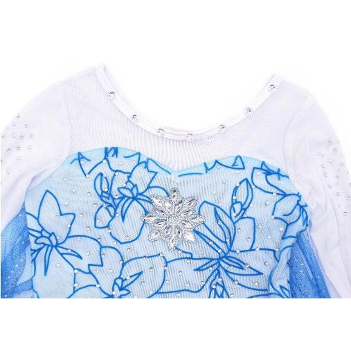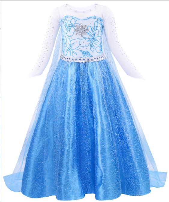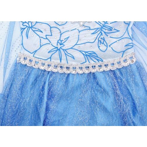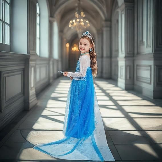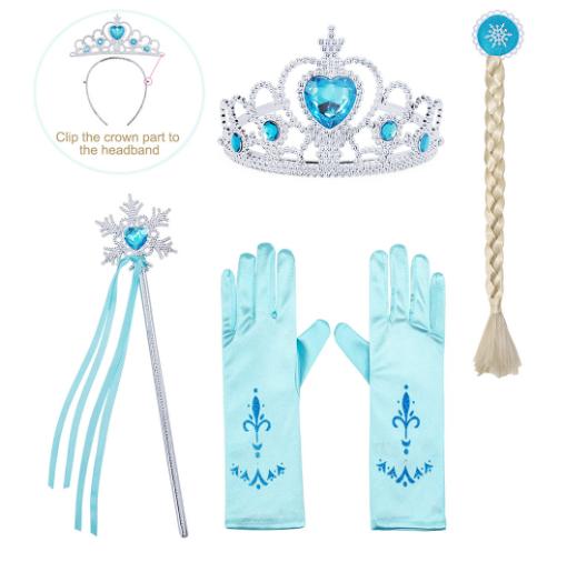 Set costum Elsa Frozen, DicBoster, 130CM, 6-8 ani, cu coroana, manusi, bagheta, coada impletita, albastru/alb
