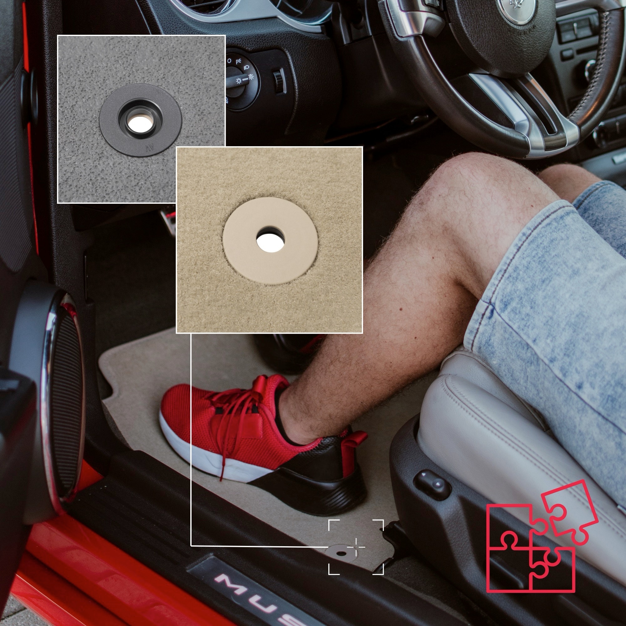 In imaginea nr. 3 din galerie prezentam tipul de prinderi incluse in set. Fii atent la acest aspect la achizitionare, deoarece in unele modele de masini pot exista mai multe tipuri de suporturi. In acest model, am folosit AV de tip circular, montat pe toate cele 4 covoare, montate pe covorasele din fata.