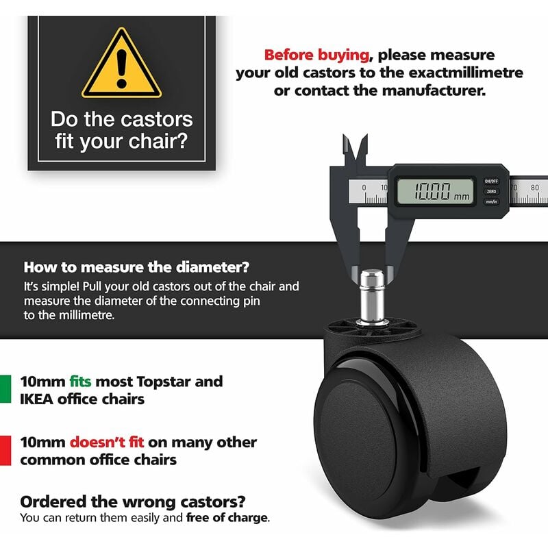 Set de 5 roti pentru scaune de birou, Fokelyi, 10 mm x 22 mm, capacitate 35 kg, culoare neagra