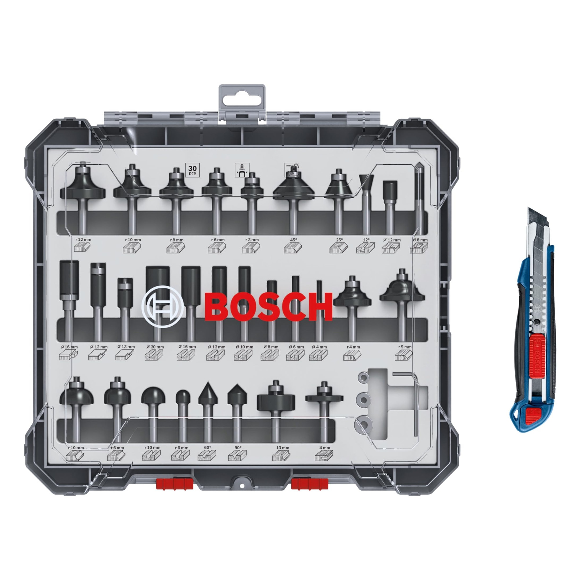 Set De Freze Bosch Cu 30 De Piese Si Lama De Taiere (Pentru Lemn, Tija Ø 8 Mm, Accesoriu Profesional Pentru Freza)