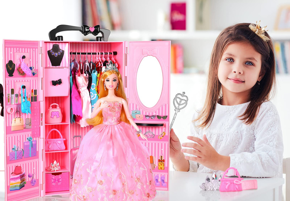Set de joaca Barbie, WALALLA, dulap de haine pentru papusi, inclusiv haine si diverse accesorii, roz