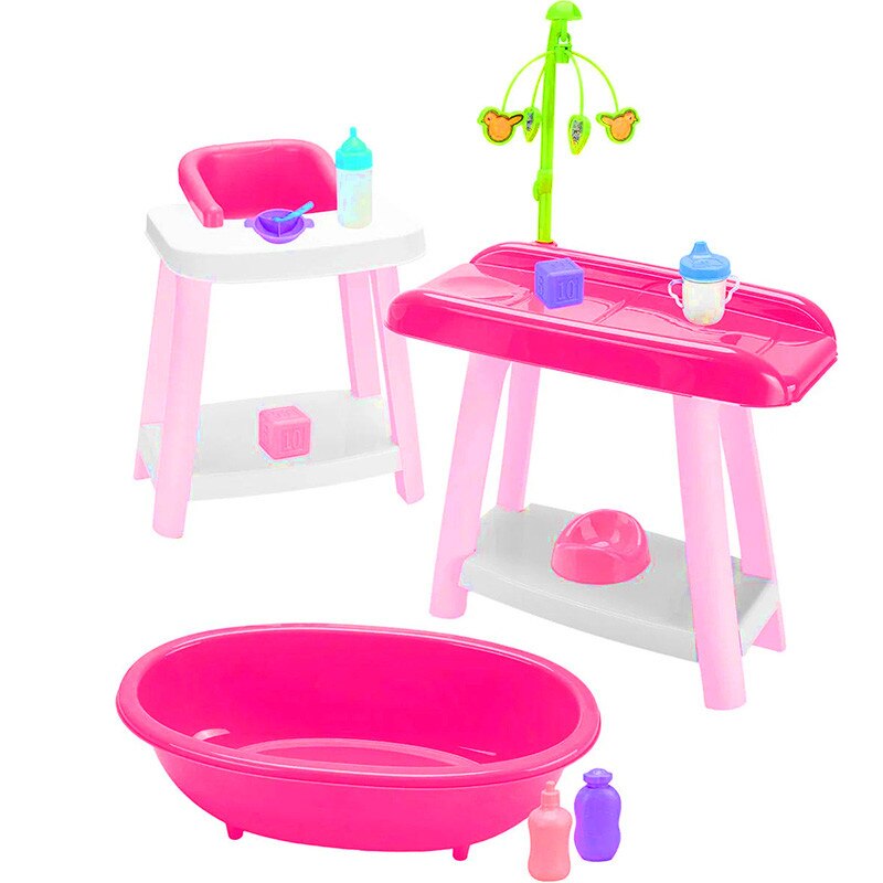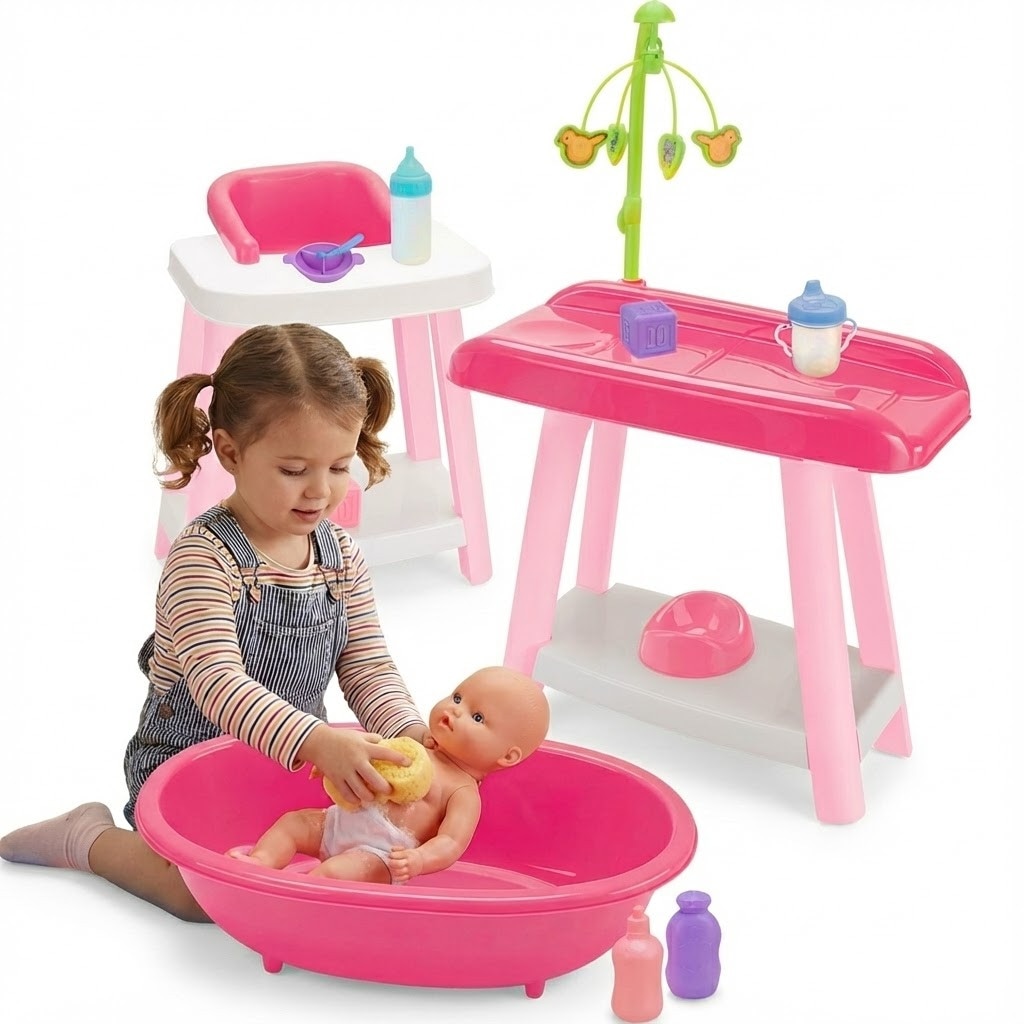 Set de Joaca Ingrijire Bebelusi,10 Accesorii, Cadita, Scaun de Masa si Masa de Infasat, bebeLOGIC™