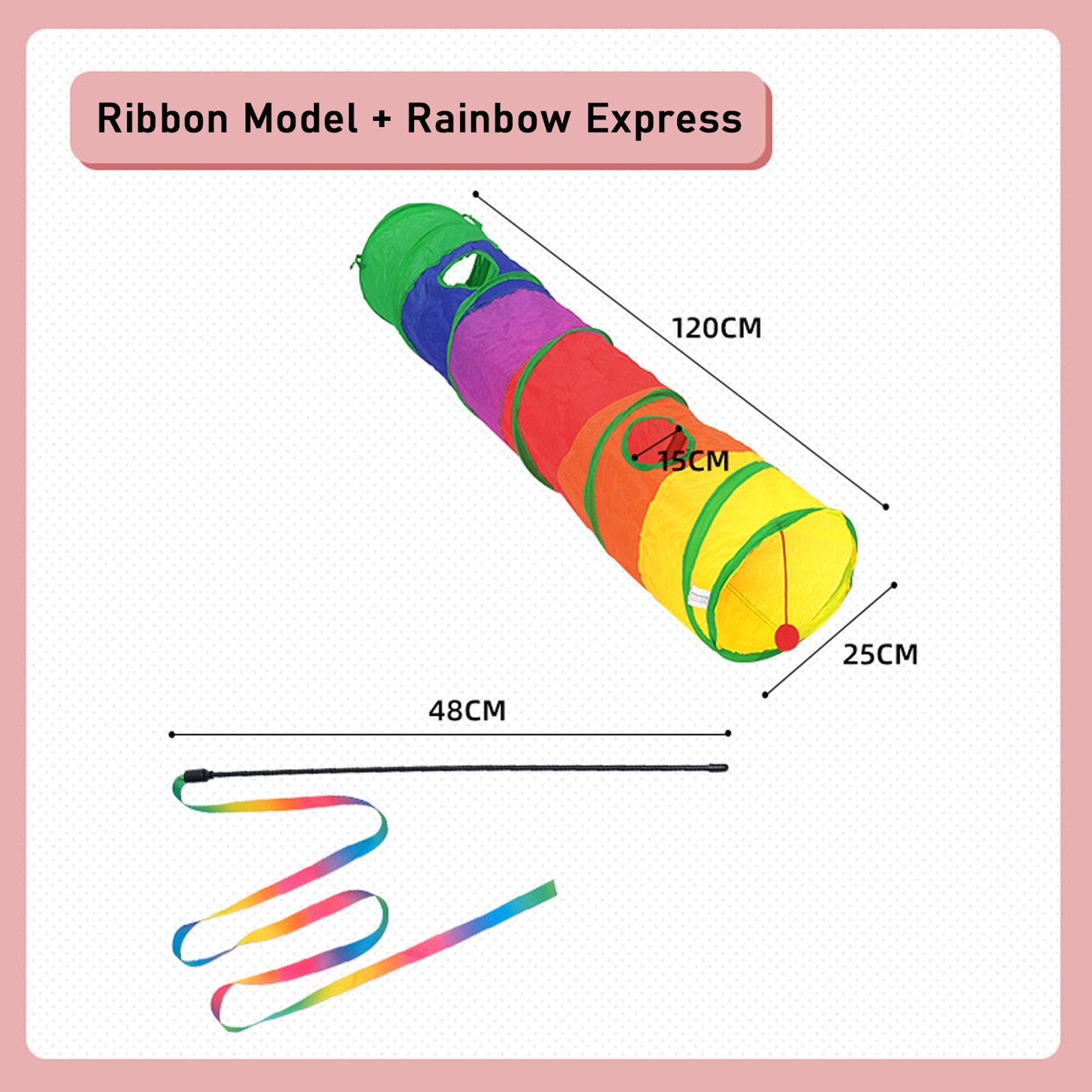 Tunelul de joaca este potrivit atat pentru pisicile tinere, cat si pentru cele adulte, aproximativ 25 x 120 cm, vine in 6 culori diferite pentru a atrage atentia animalelor de companie si are o minge cu clopotel de la iesirea din tunelul pentru pisici pentru joc interactiv; Designul pliabil poate fi pliat sau deschis cu usurinta in cateva secunde pentru depozitare