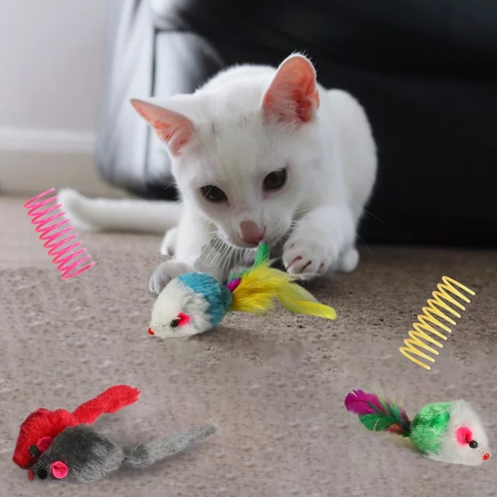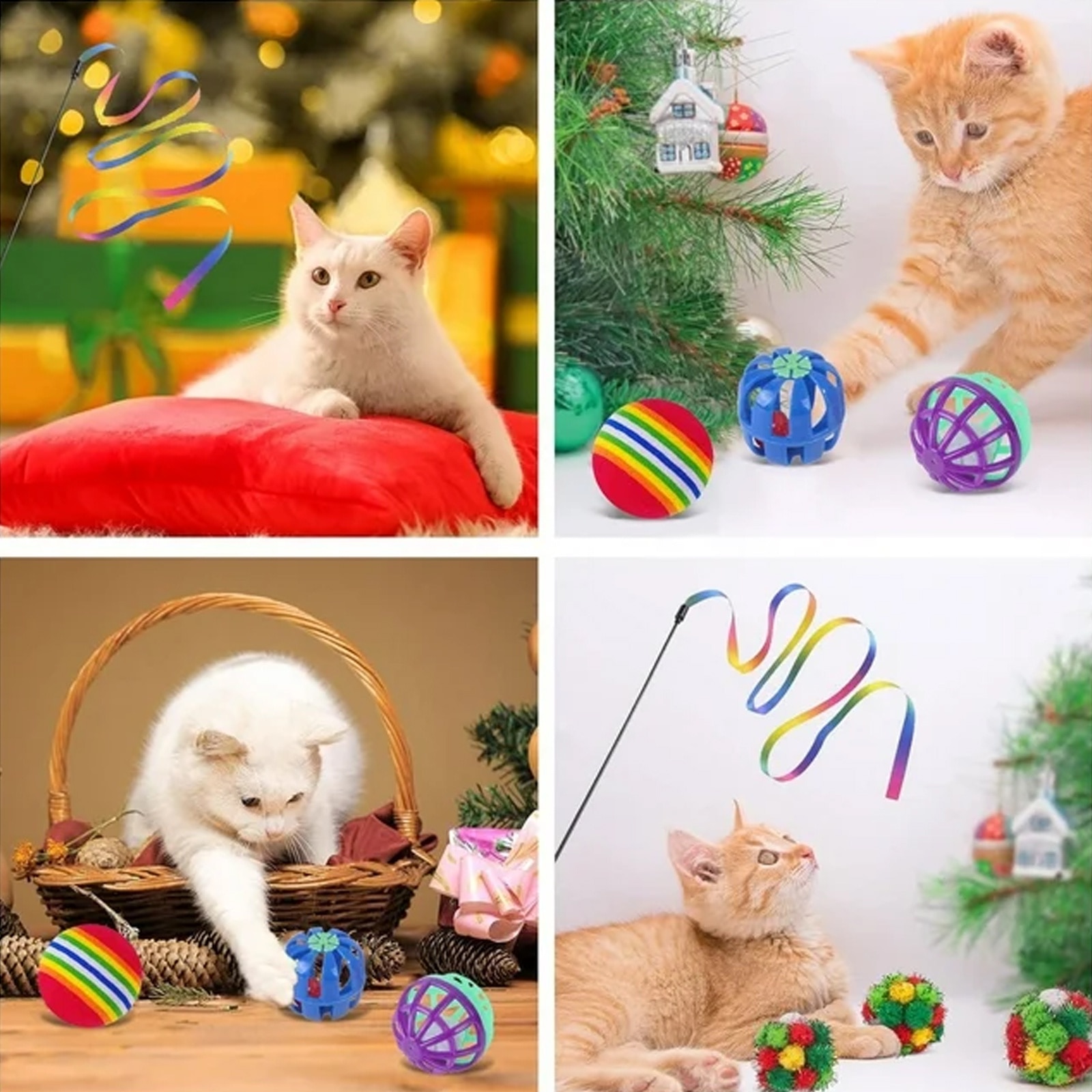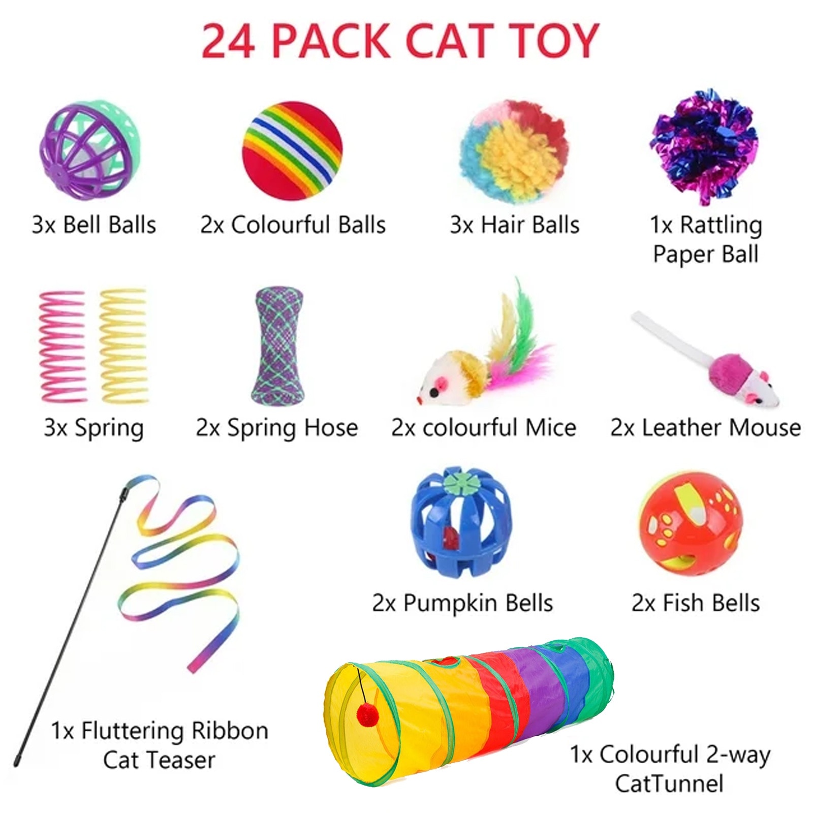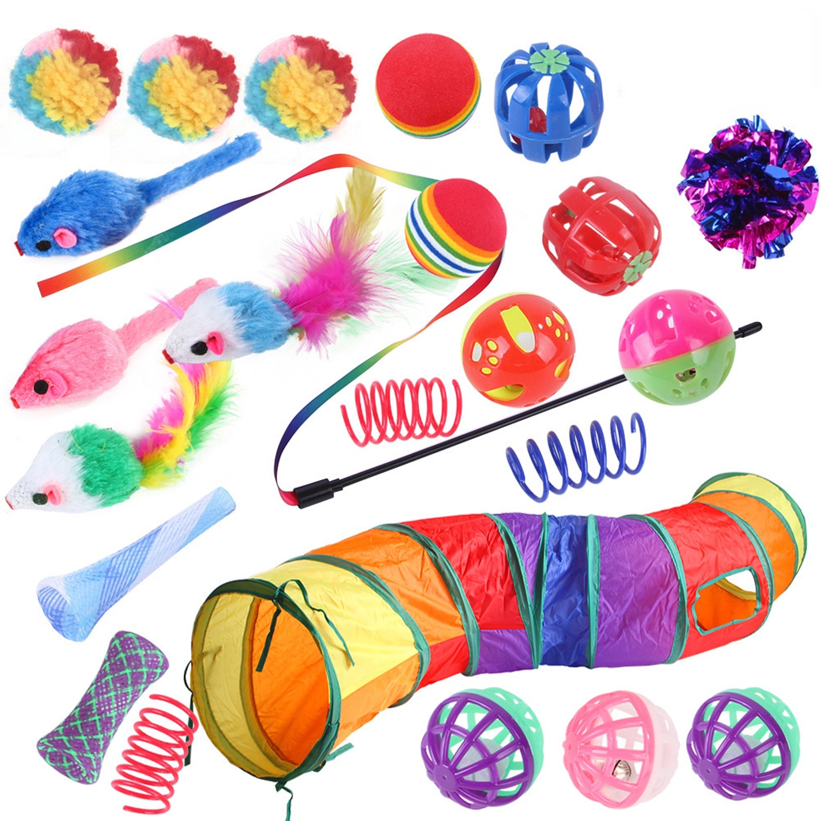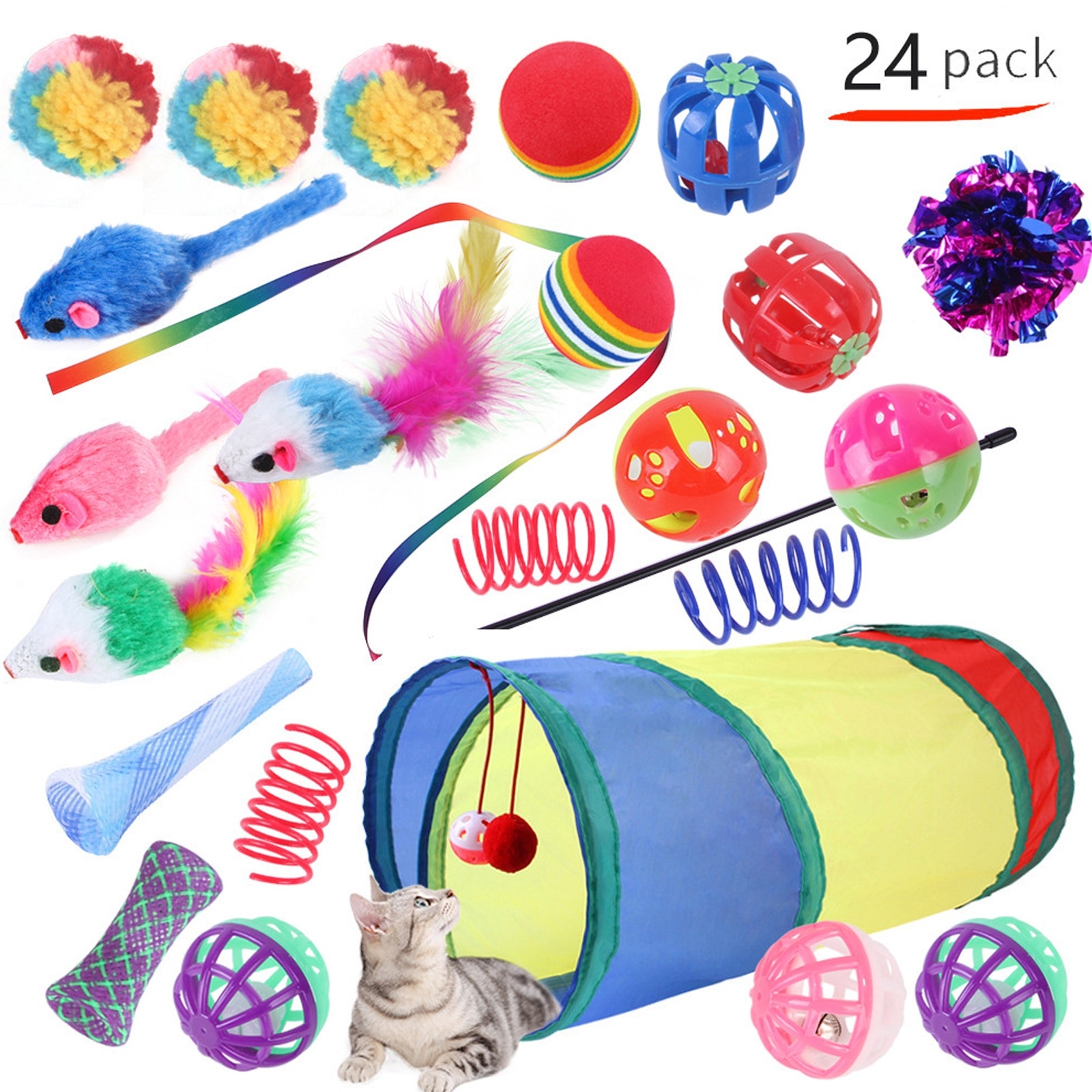 Un total de 24 de jucarii pentru pisici, inclusiv jucarii de simulare a soarecilor (4 bucati), diverse bile de jucarie pentru pisici (13 de bucati), jucarii de primavara (3 bucati), furtun de primavara (2 bucati), bagheta de tachinare a pisicii (1 bucata), tunel (1 bucata); Pentru pisici de interior si pisoi