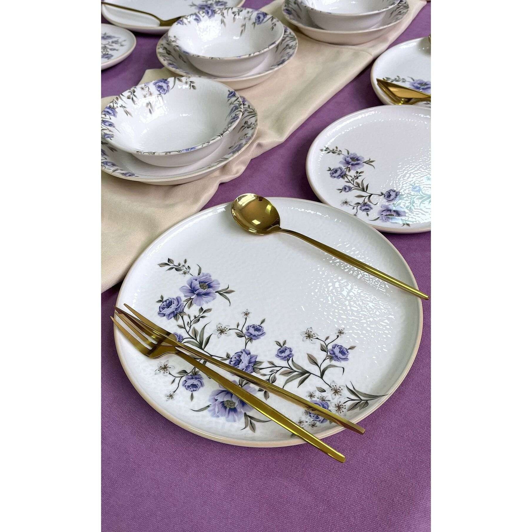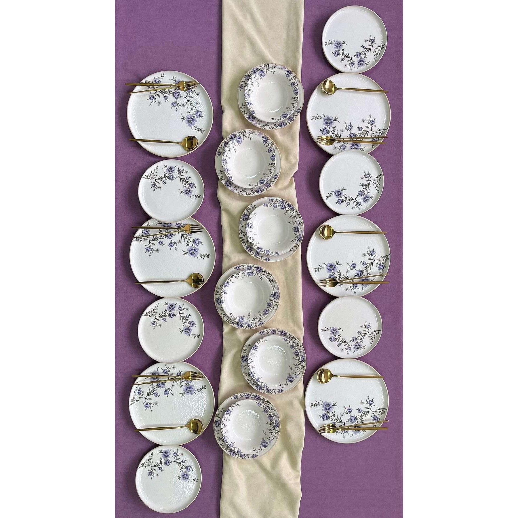 Set de masa 24 piese, Hermia Concept, alb, mov, ceramica, rezistent la masina de spalat vase si cuptor cu microunde