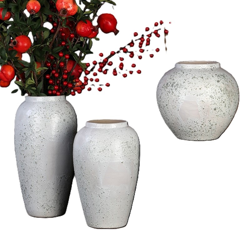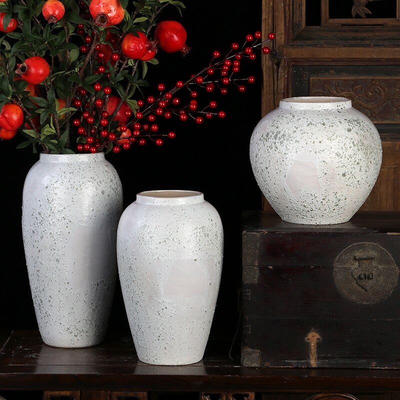 Set decorativ cu 3 vaze din ceramica alba, finisaj rustic, lucrate manual in stil chinezesc retro. Potrivite pentru flori sau ca elemente de decor