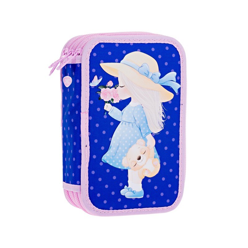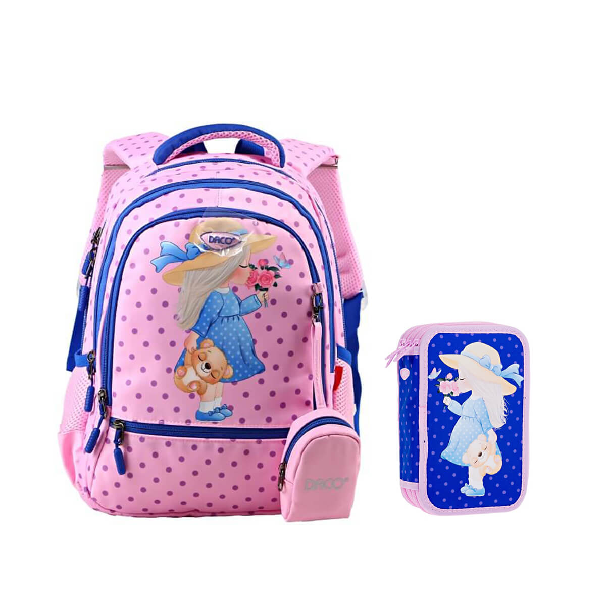 Set ghiozdan si penar Daco, 3 compartimente, roz/albastru, 38x30x17cm, pentru clasa pregatitoare, imprimeu fetita cu ursulet de plus