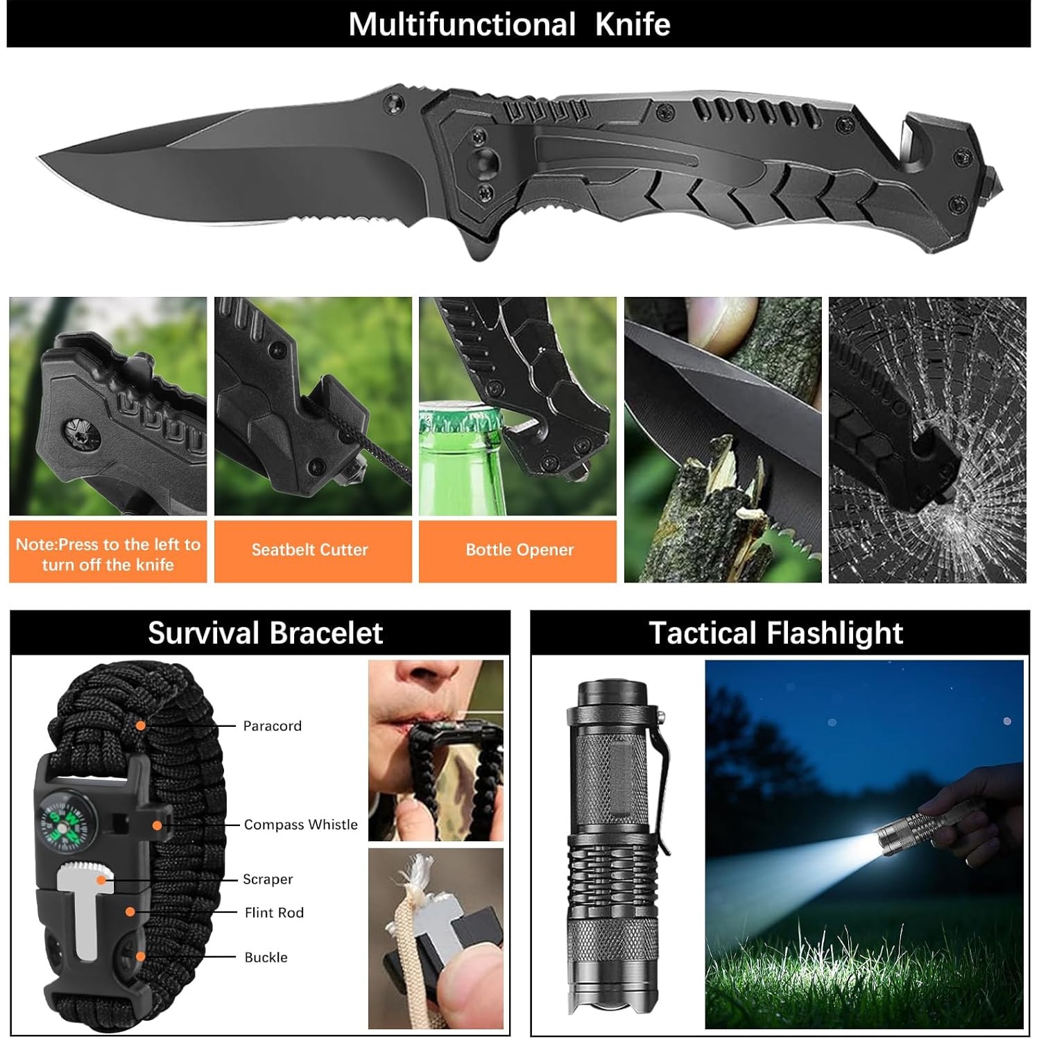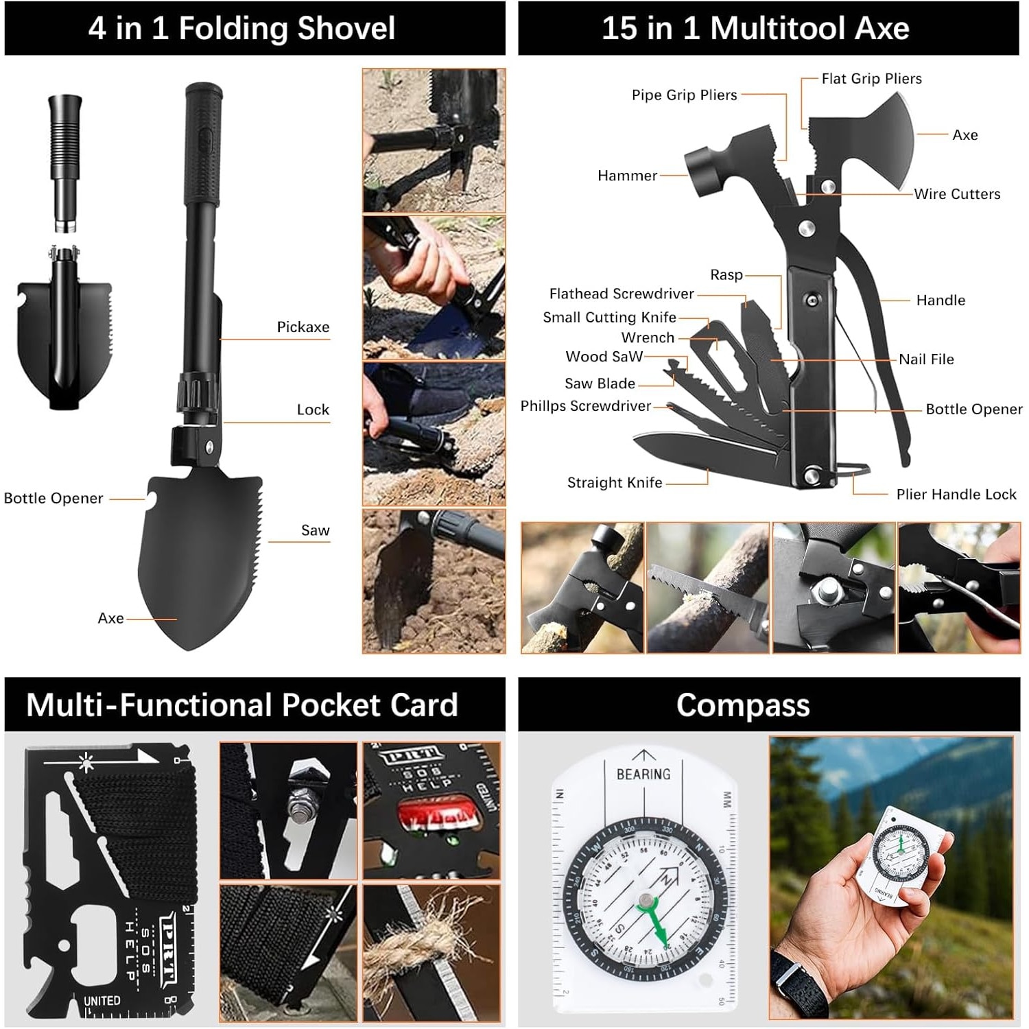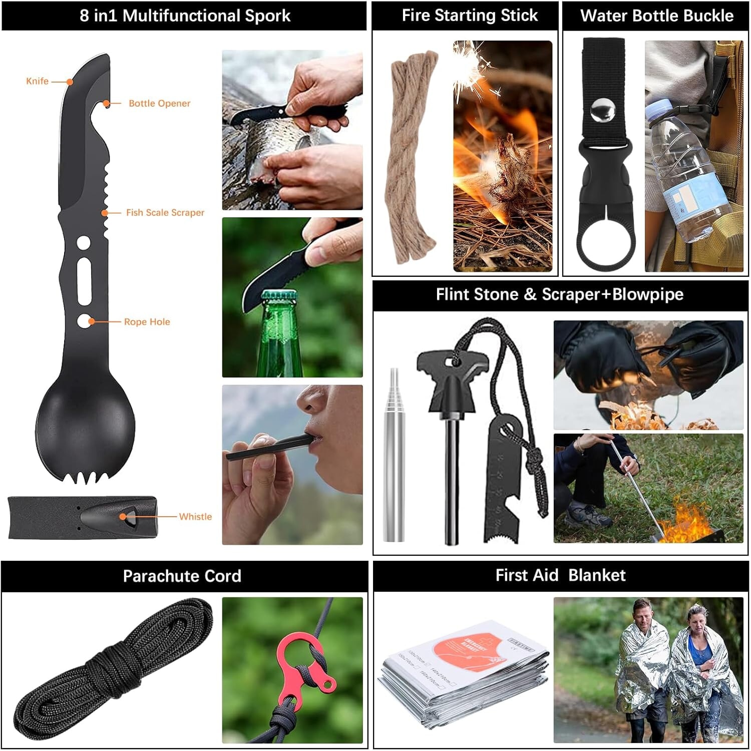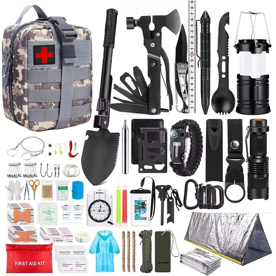 Set kit de supravietuire multifunctional, echipament de urgenta pentru drumetii, camping, calatorii, busola, trusa de prim ajutor, bandaje, plasturi, lanterna, pelerine de ploaie, trusa de prim ajutor, cort de urgenta, accesorii de pescuit