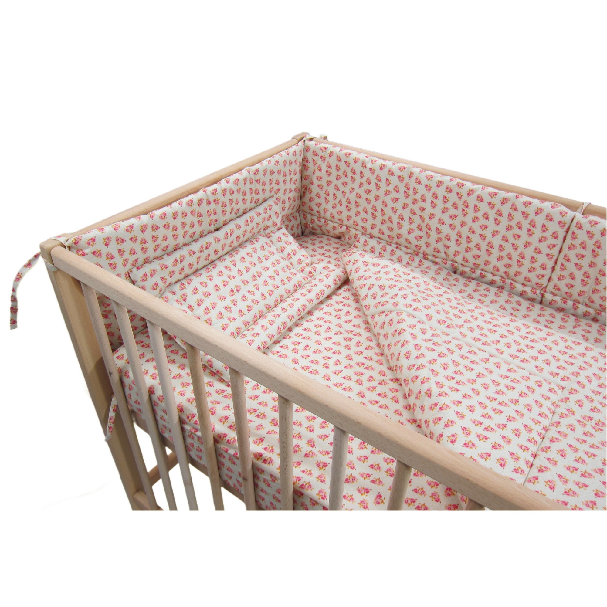 Set lenjerie matlasata 4 piese, 120x60cm, bumbac Oeko Tex, cearceaf, plapuma, pernuta, bumper PPSL4P trandafiri, Primii Pasi